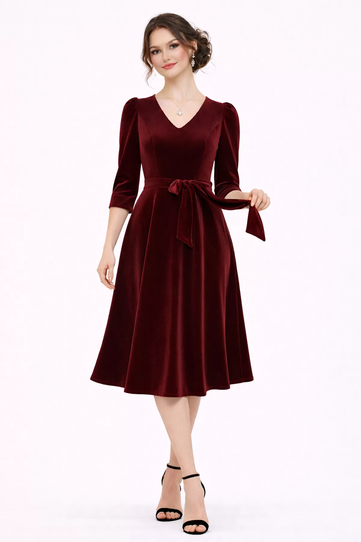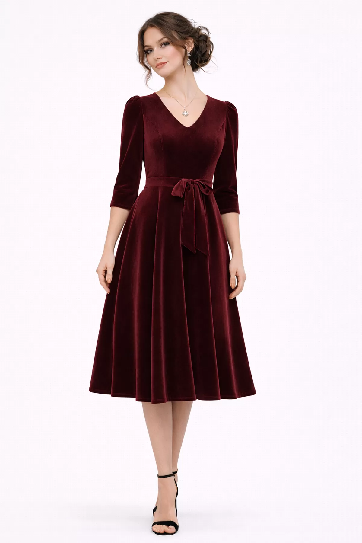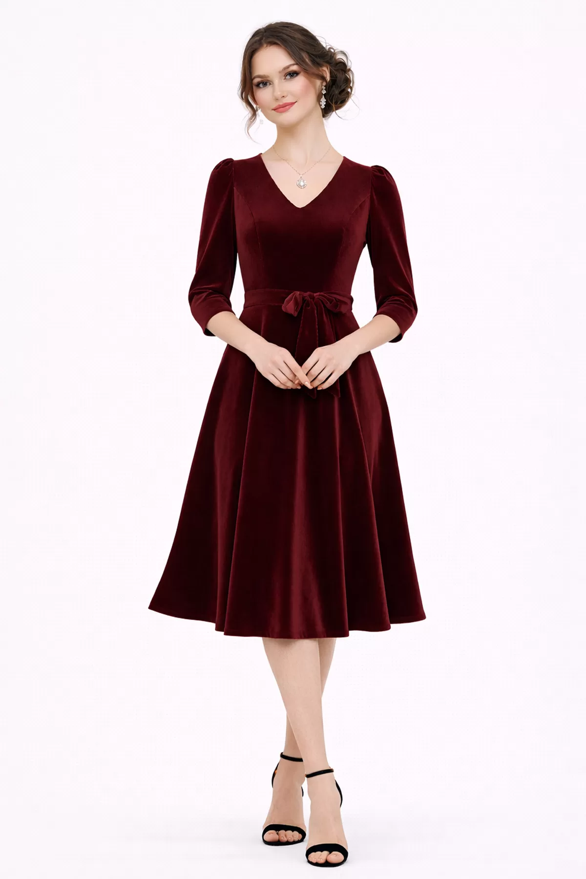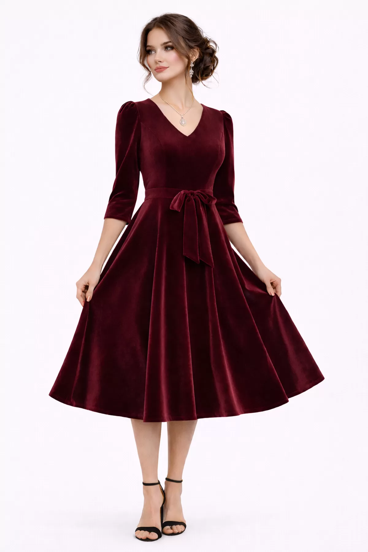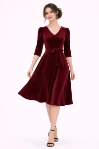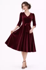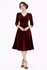 Kadın Bordo Kadife Truvakar Kol V Yaka Kuşaklı Kloş Midi Boy Abiye Mezuniyet Davet Elbisesi