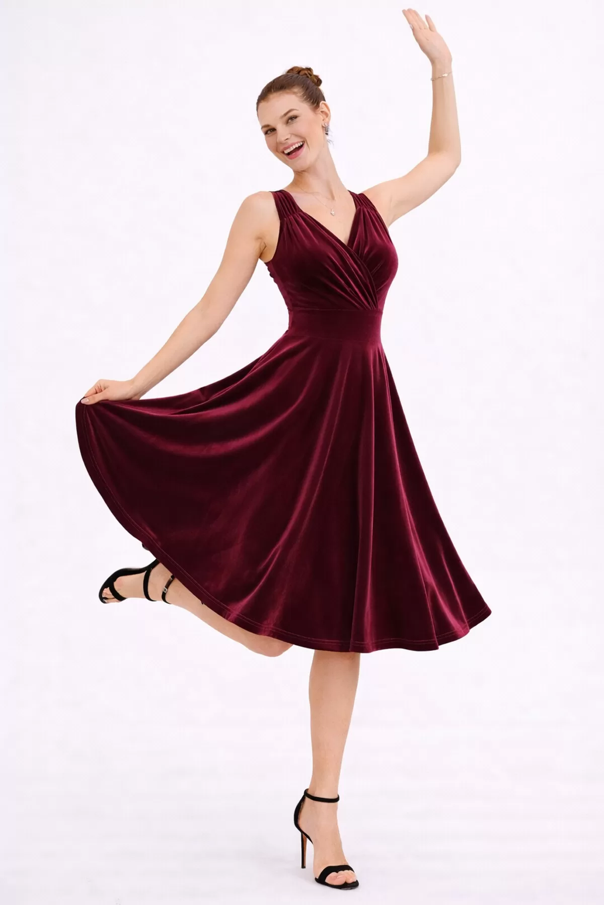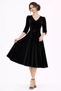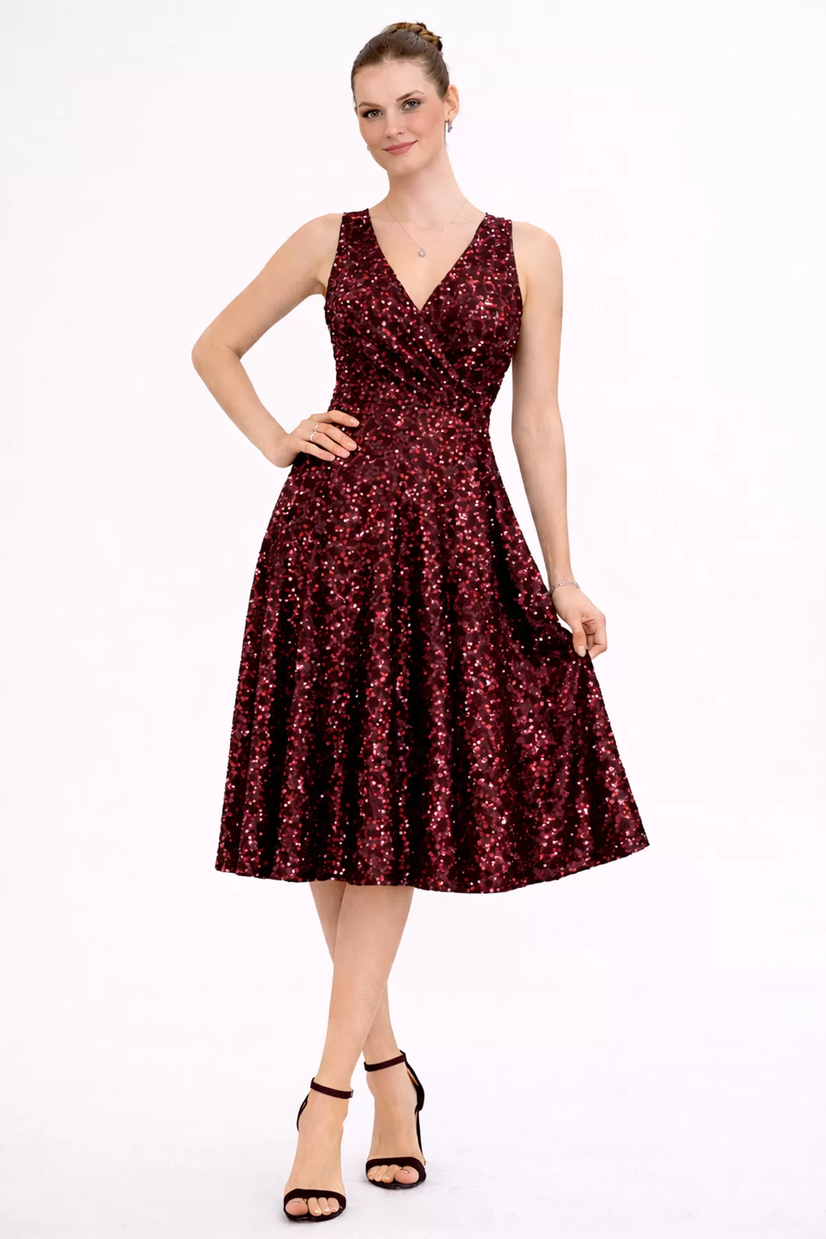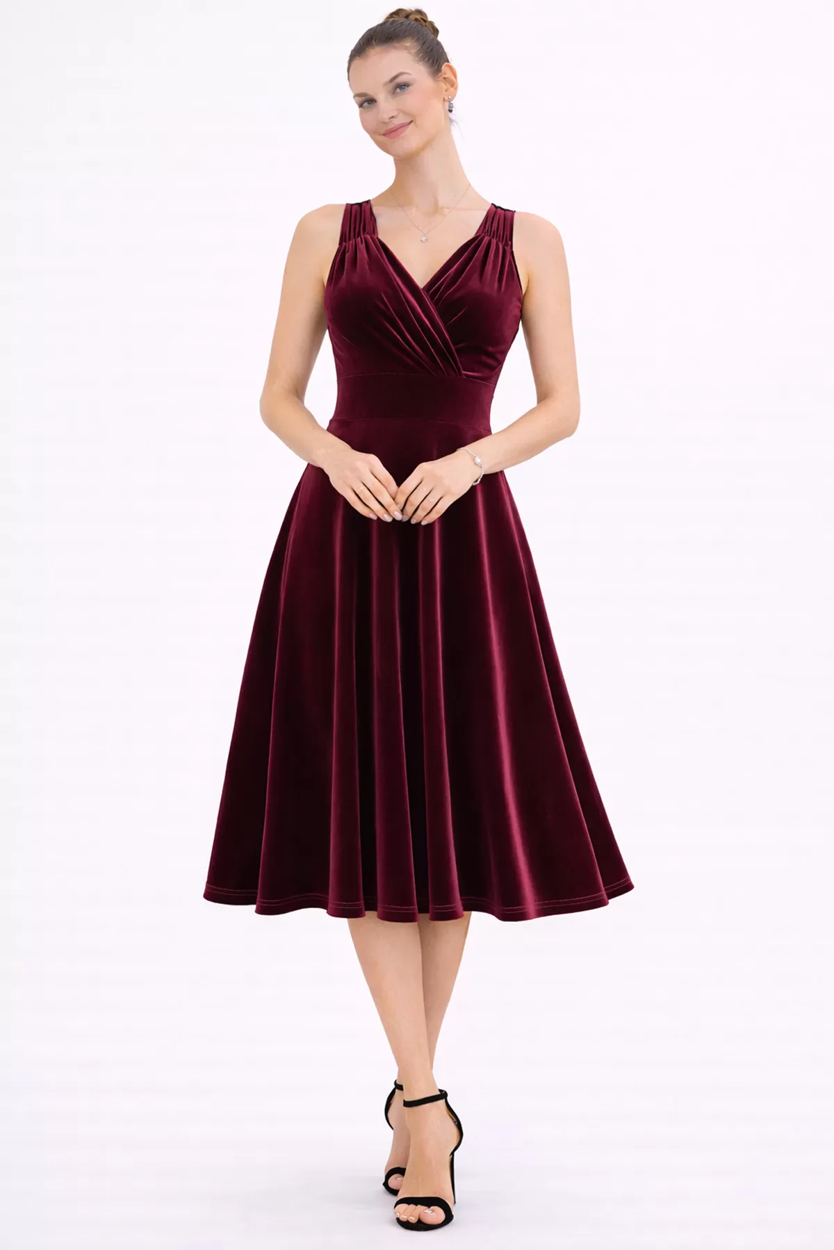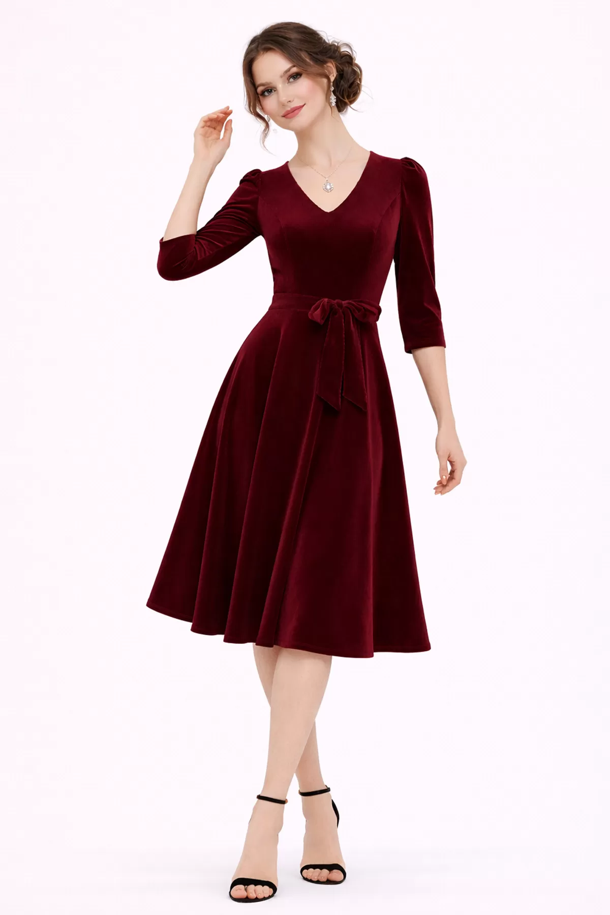 Kadın Bordo Kadife Truvakar Kol V Yaka Kuşaklı Kloş Midi Boy Abiye Mezuniyet Davet Elbisesi