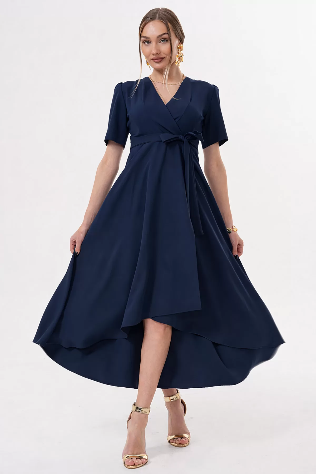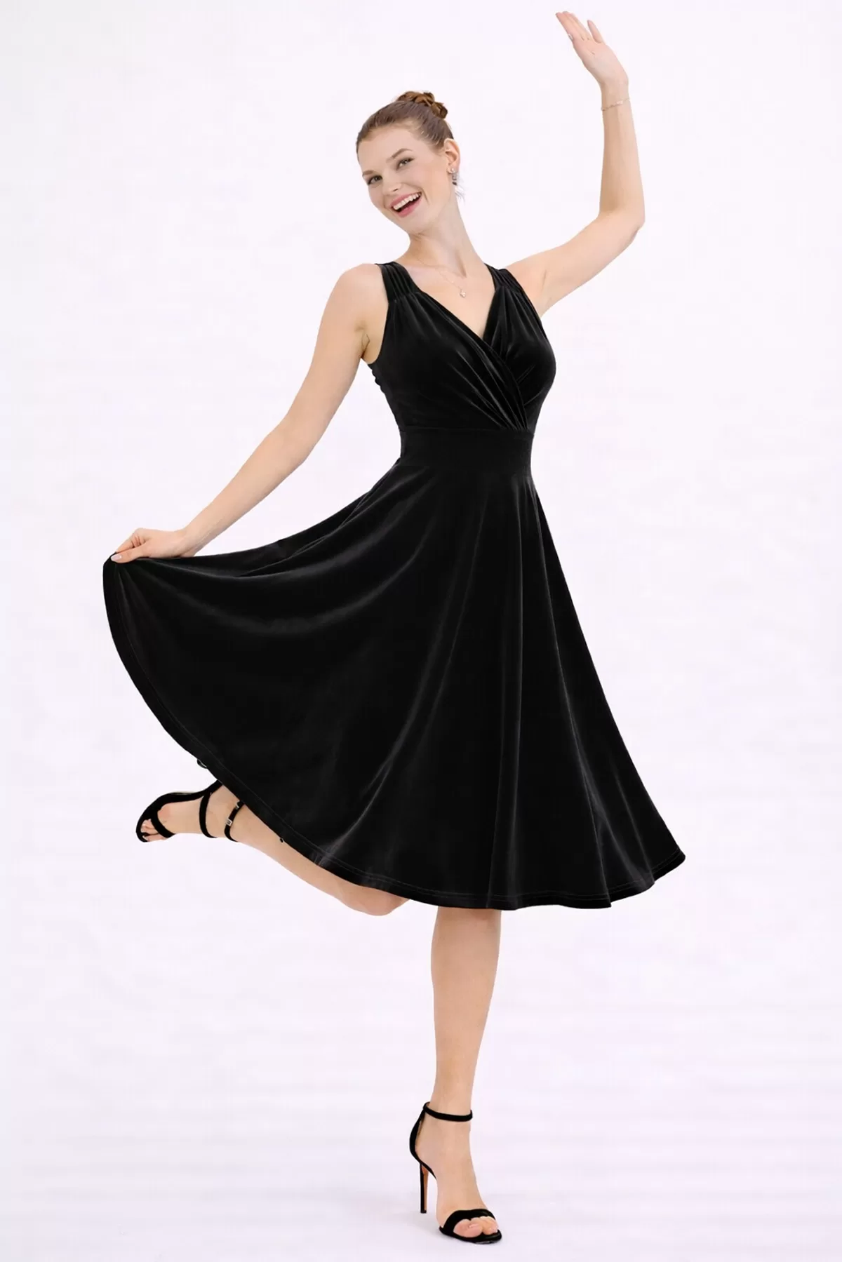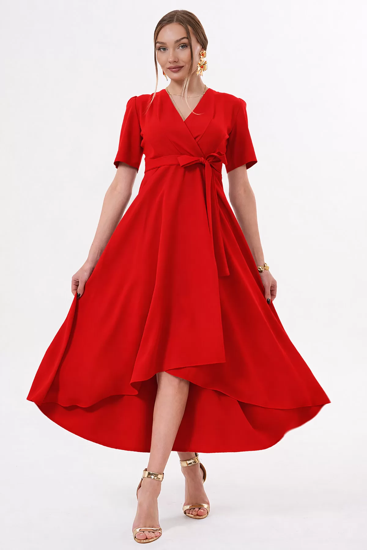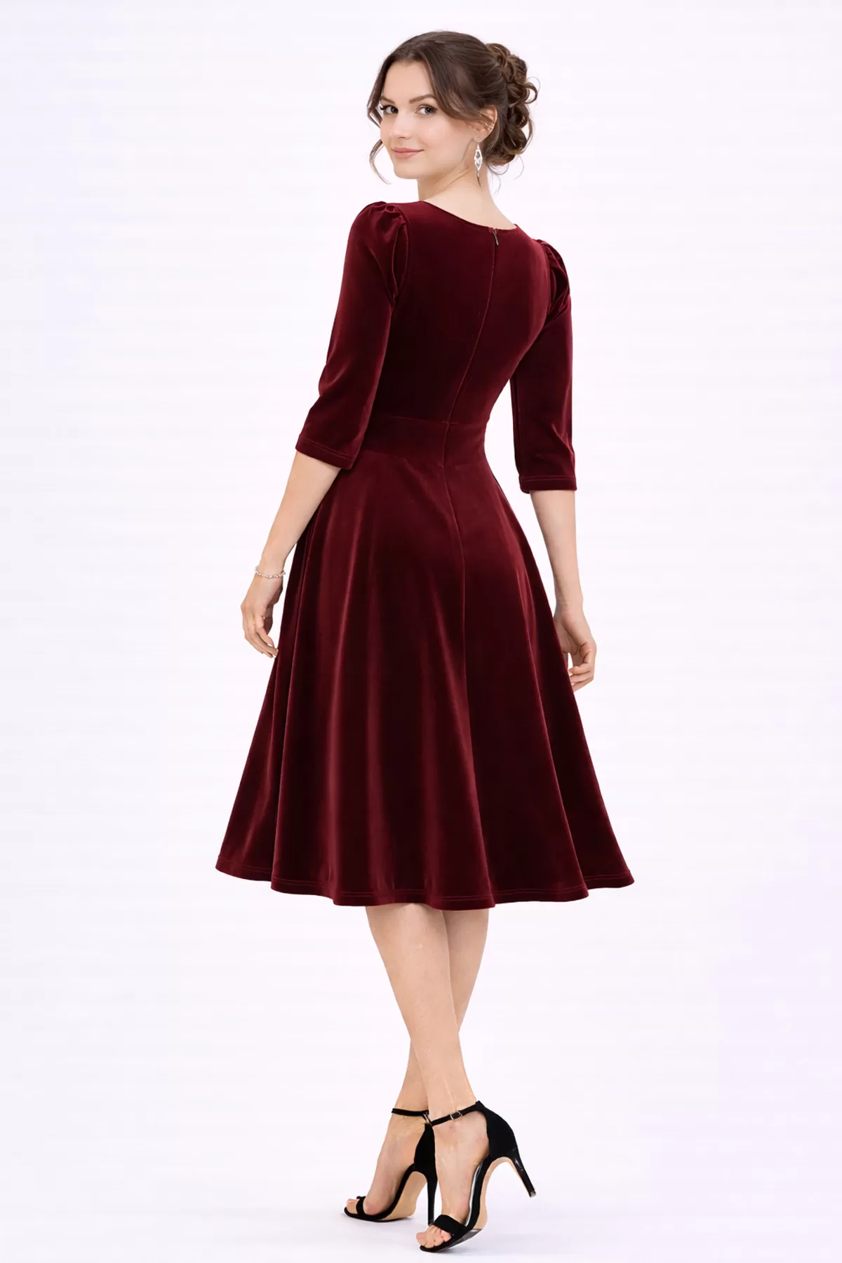 Kadın Bordo Kadife Truvakar Kol V Yaka Kuşaklı Kloş Midi Boy Abiye Mezuniyet Davet Elbisesi