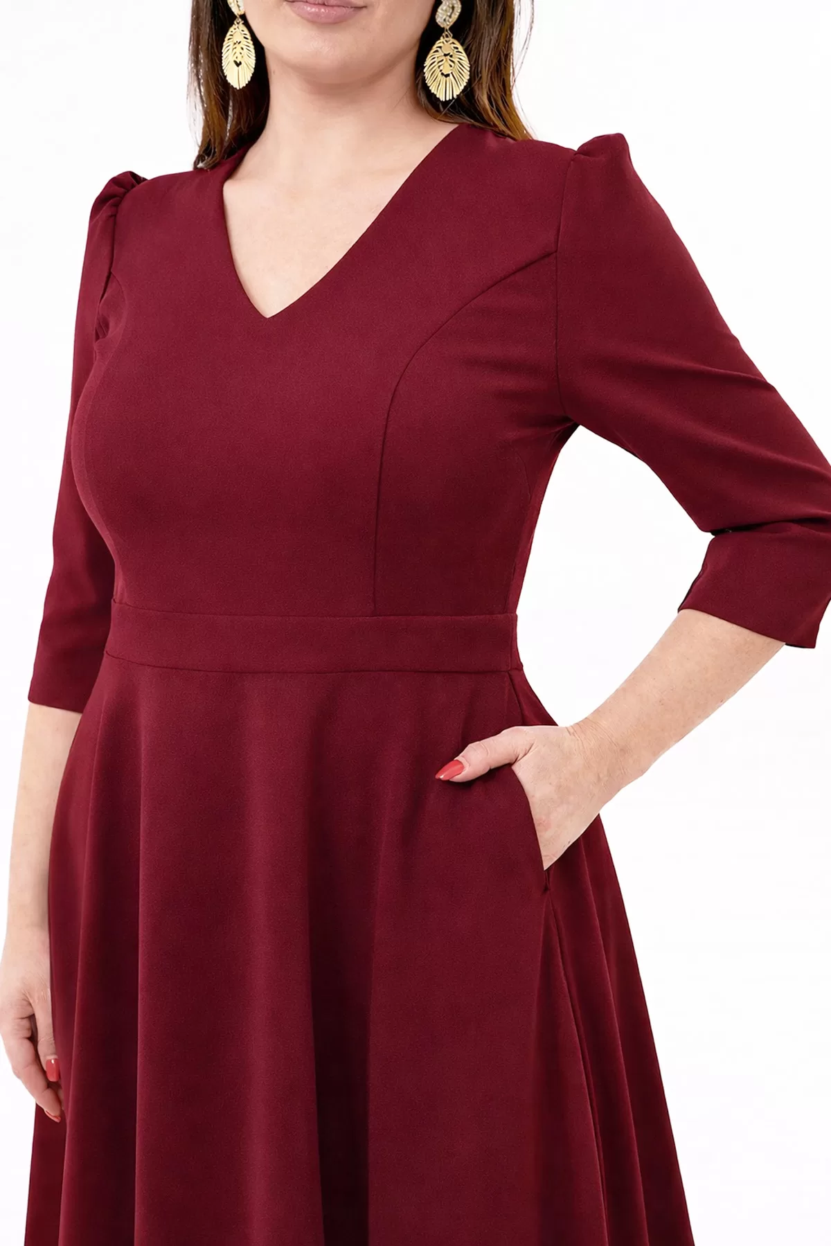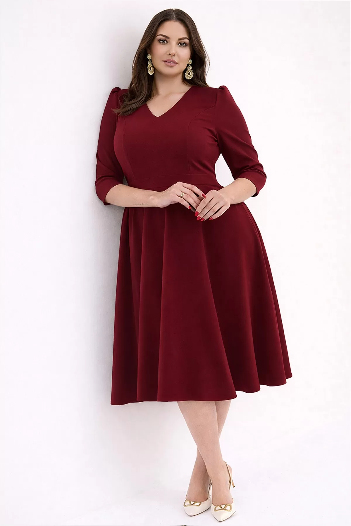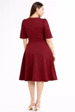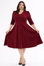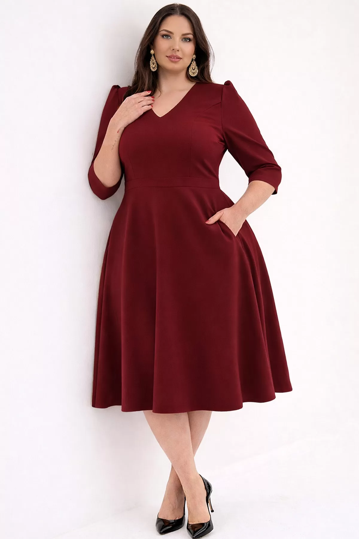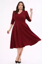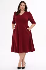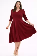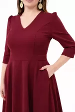 Kadın Bordo V Yaka Cepli Truvakar Kol Midi Kloş Double Kumaş Büyük Beden Elbise