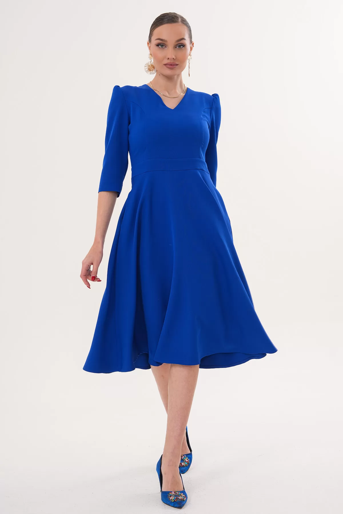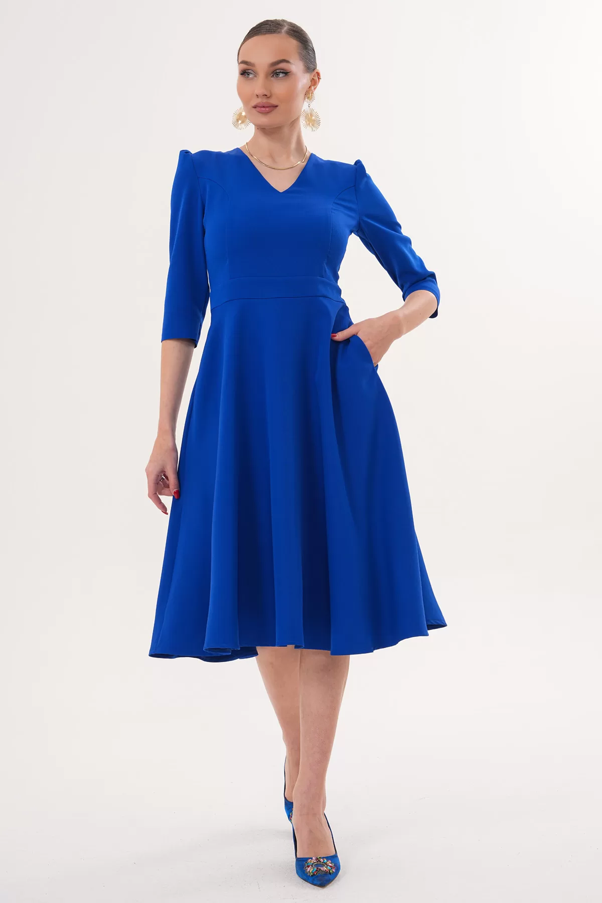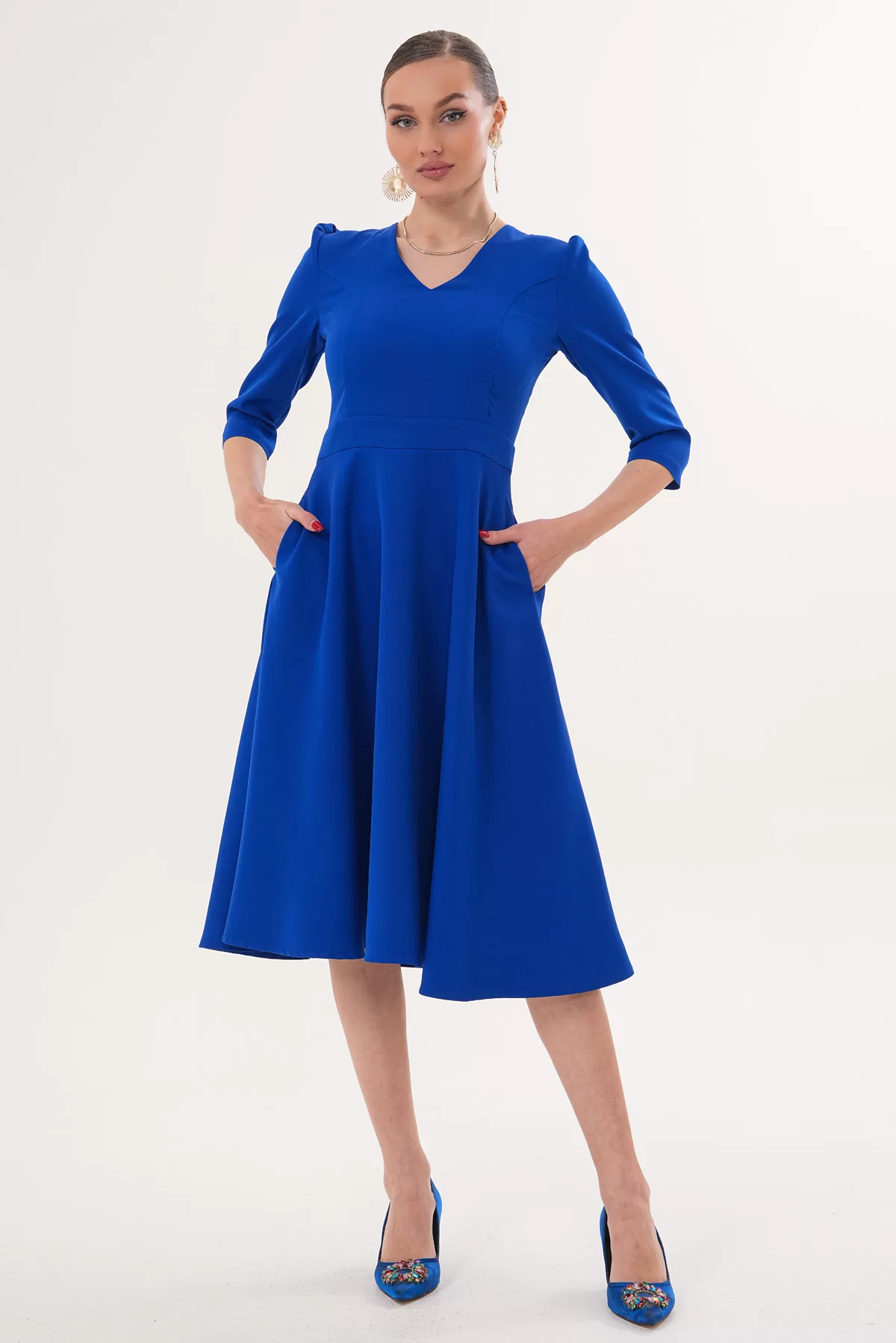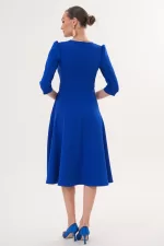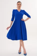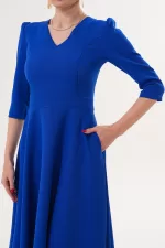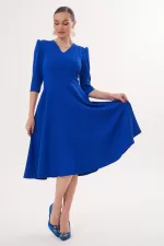 Kadın Saks Mavi V Yaka Cepli Truvakar Kol Midi Kloş Double Kumaş Elbise