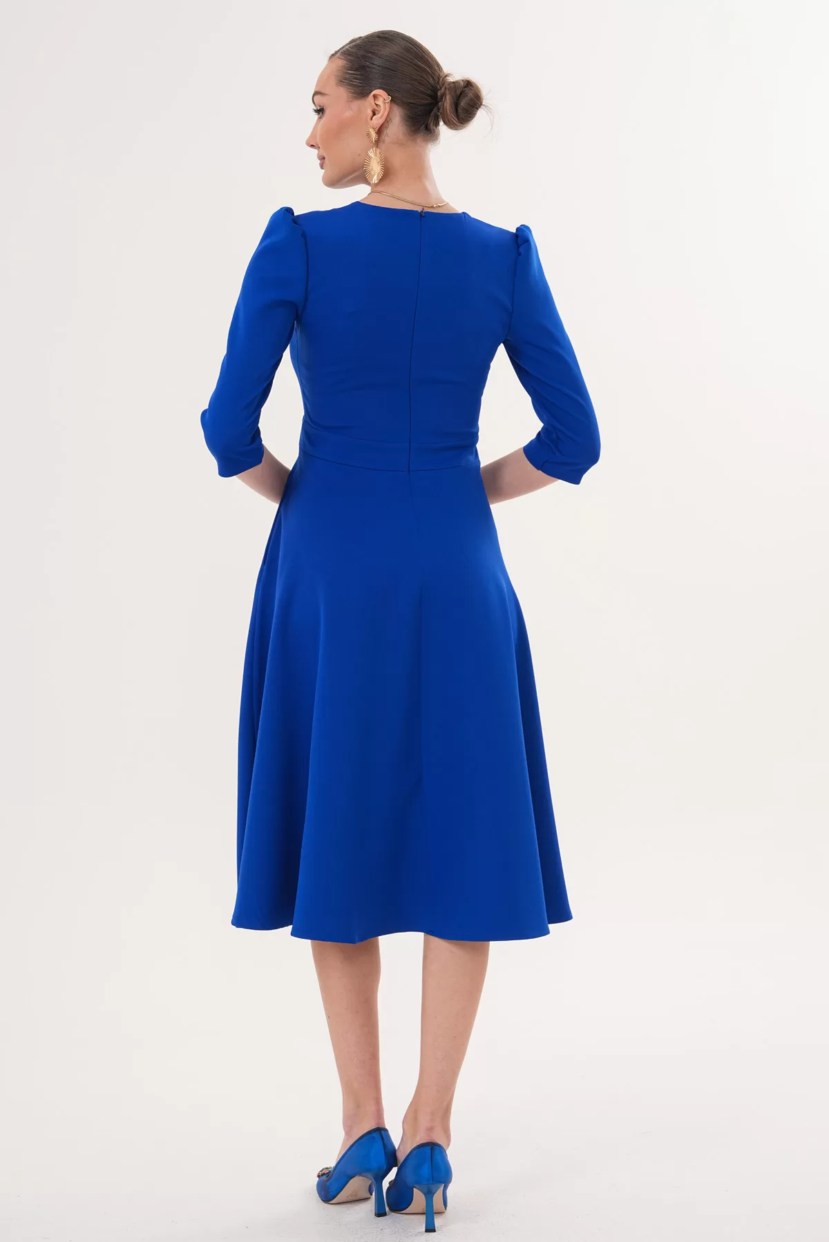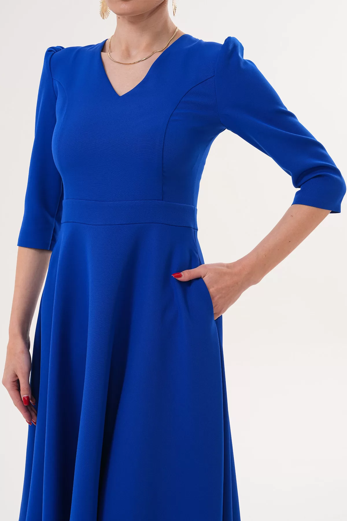 RURIS Kadın Saks Mavi V Yaka Cepli Truvakar Kol Midi Kloş Double Kumaş Elbise – Ürün Açıklaması