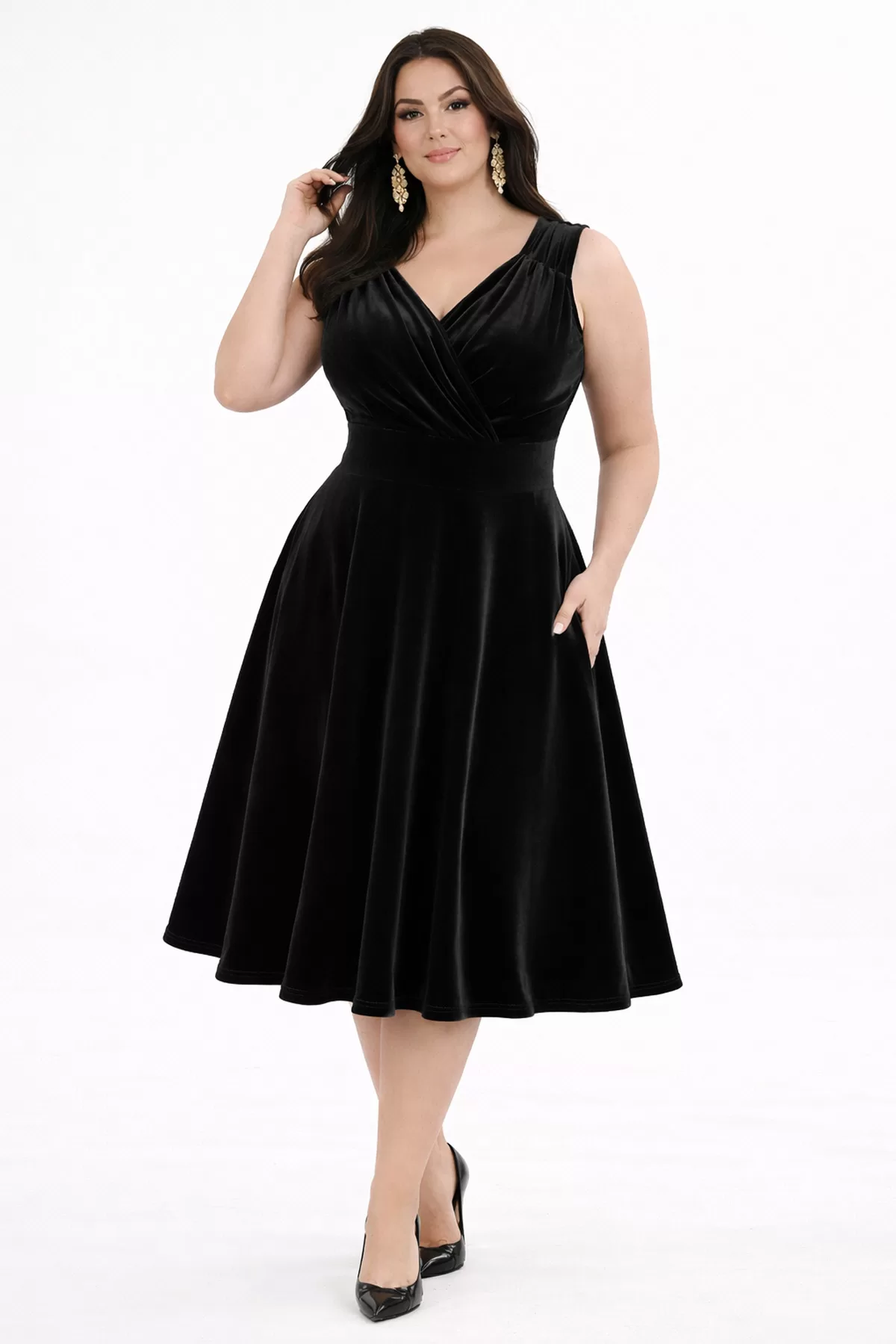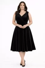 Ruris Kadın Siyah Kadife Kruvaze Yaka Kloş Midi Boy Büyük Beden Abiye