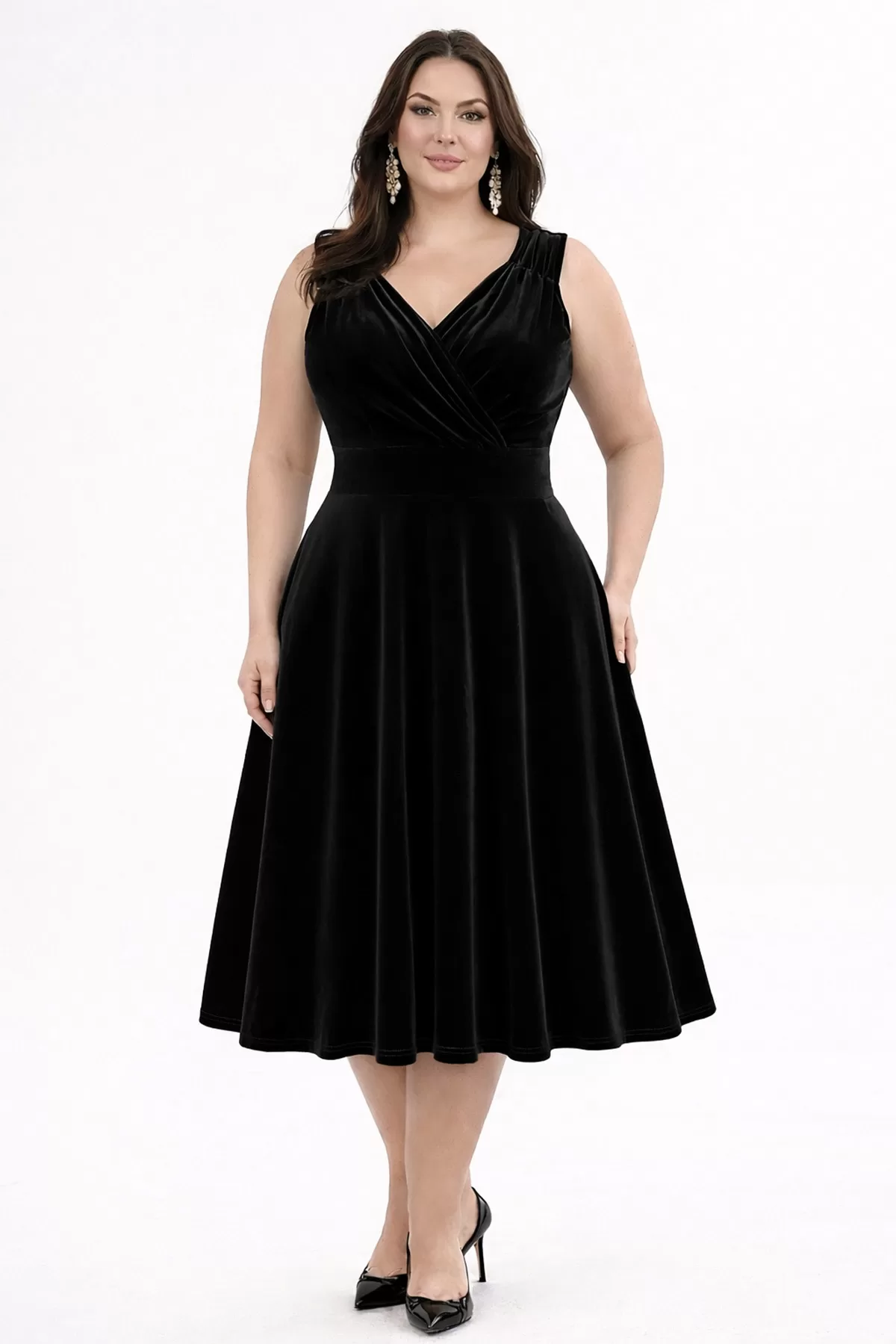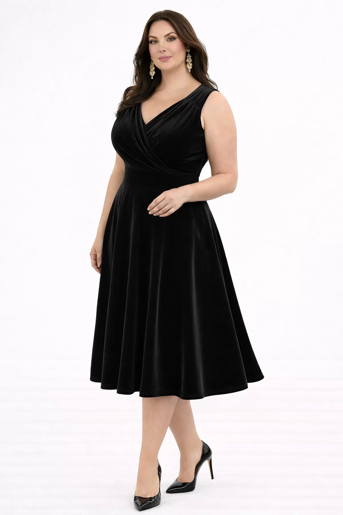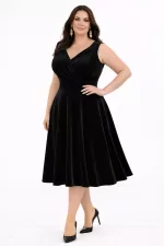 Ruris Kadın Siyah Kadife Kruvaze Yaka Kloş Midi Boy Büyük Beden Abiye Elbise