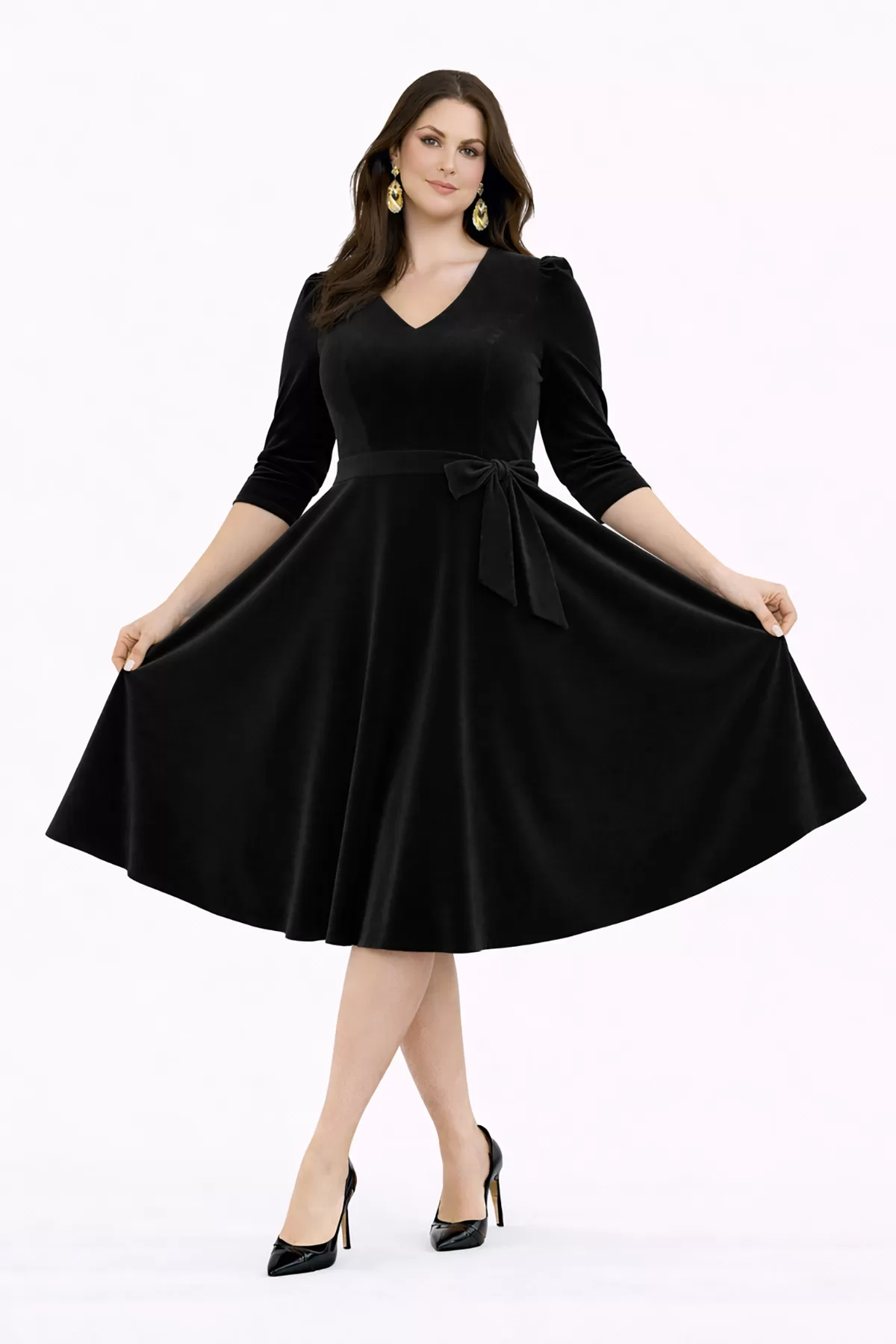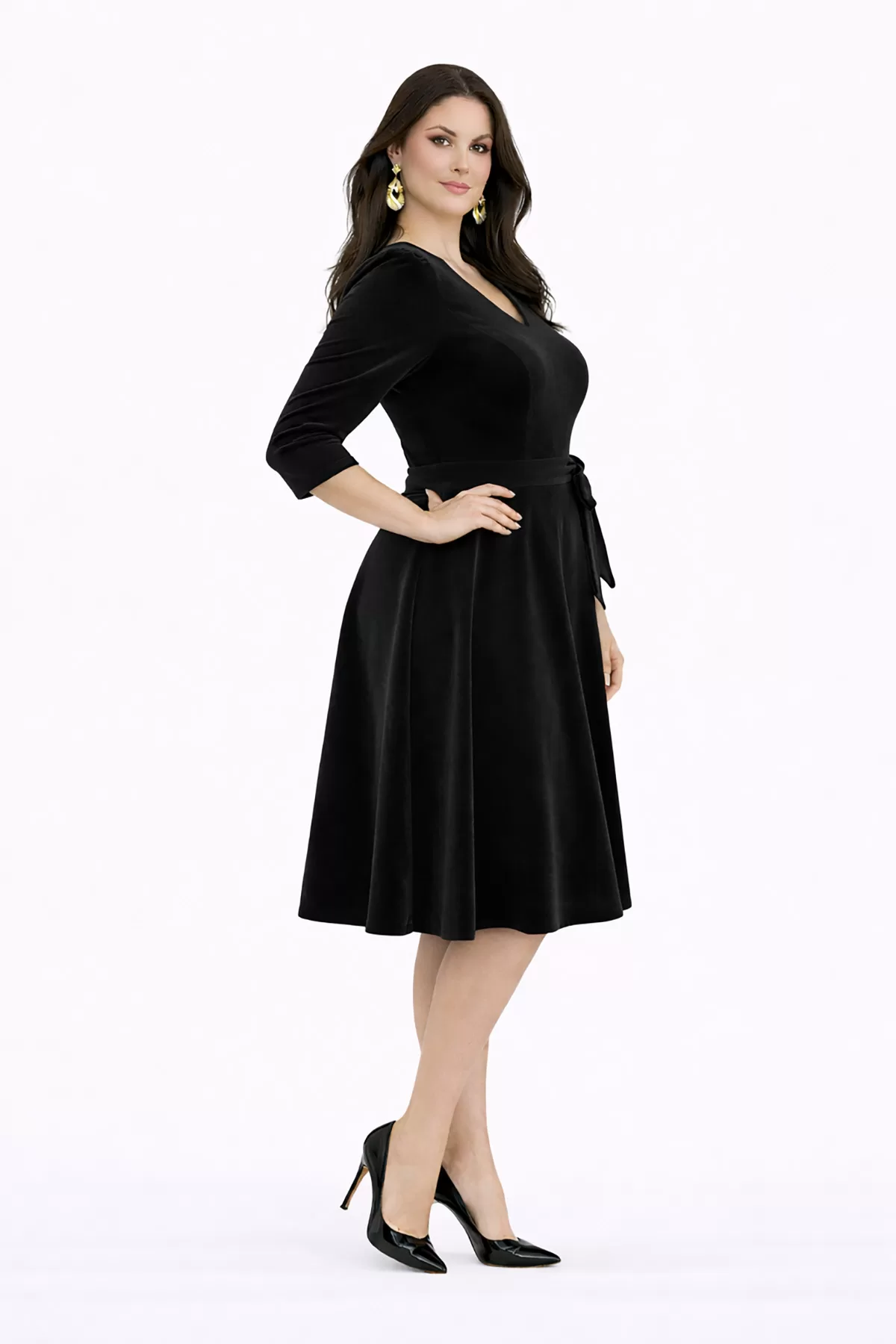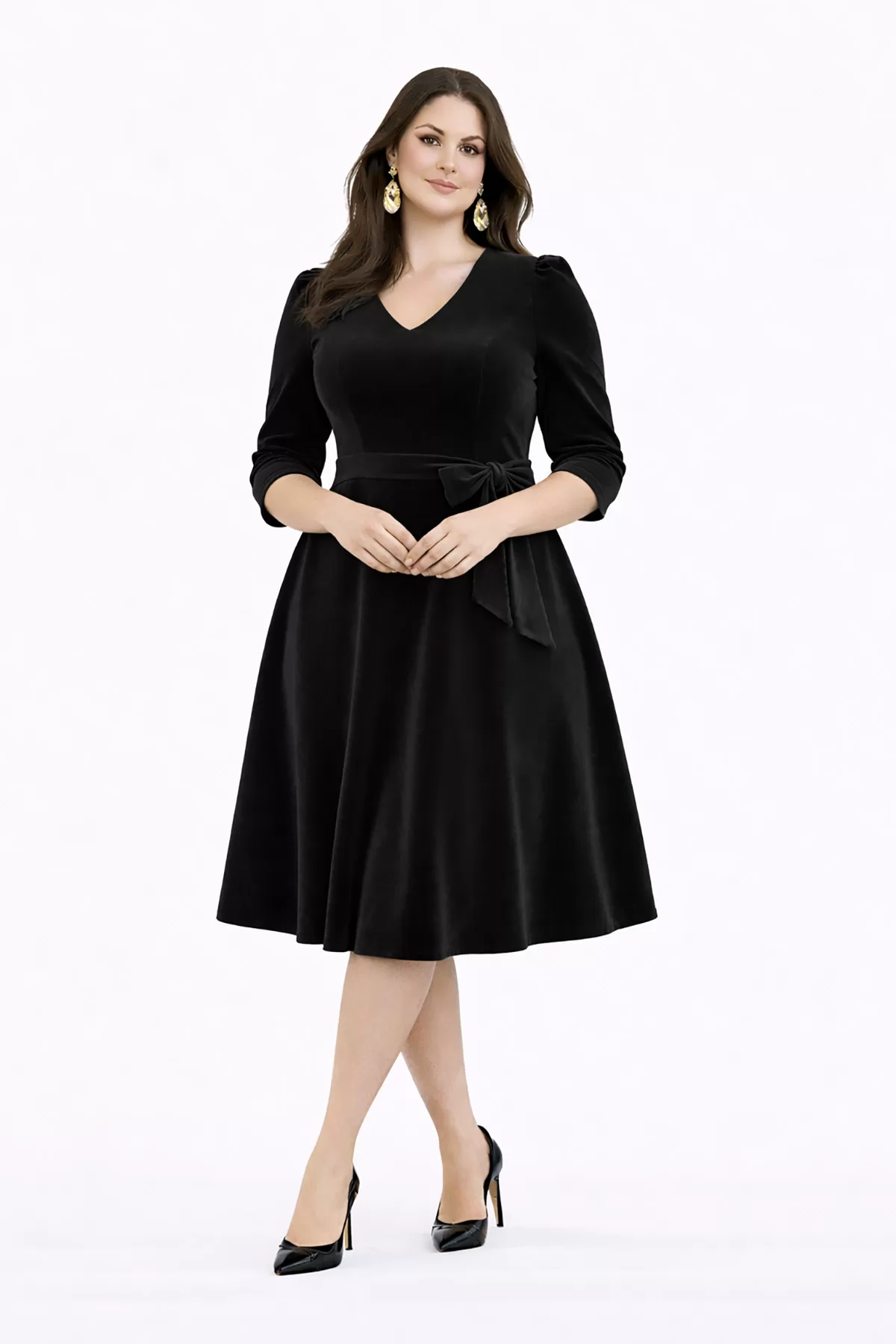 Ruris Kadın Siyah Kadife Truvakar Kol V Yaka Kuşaklı Kloş Midi Boy Büyük Beden