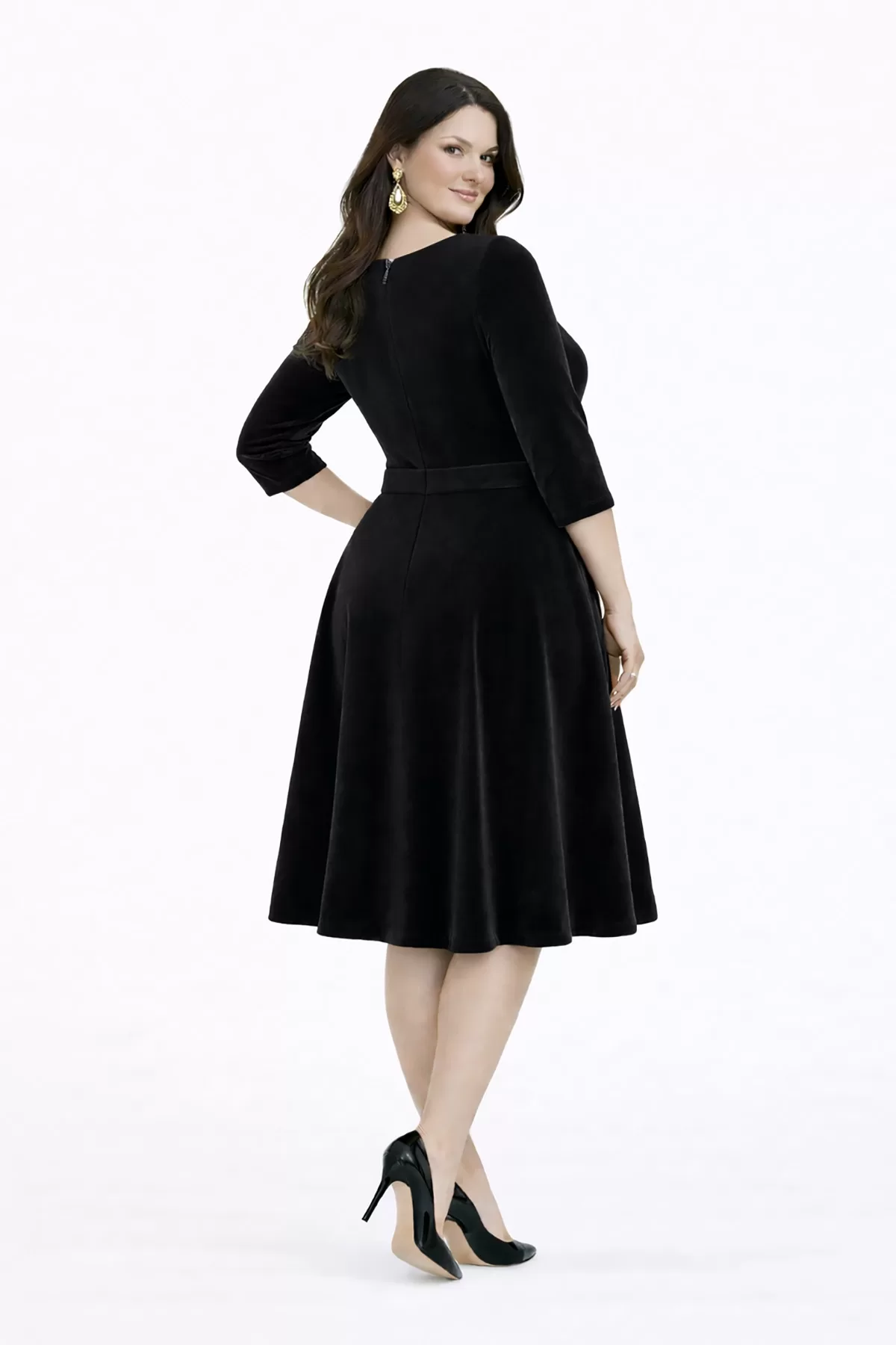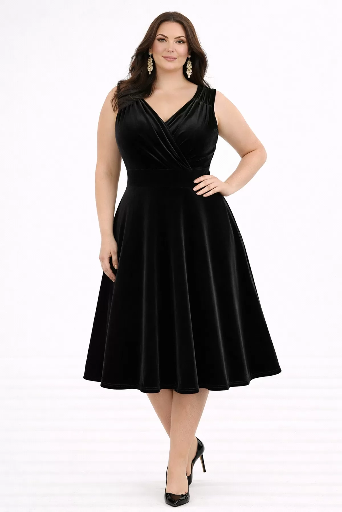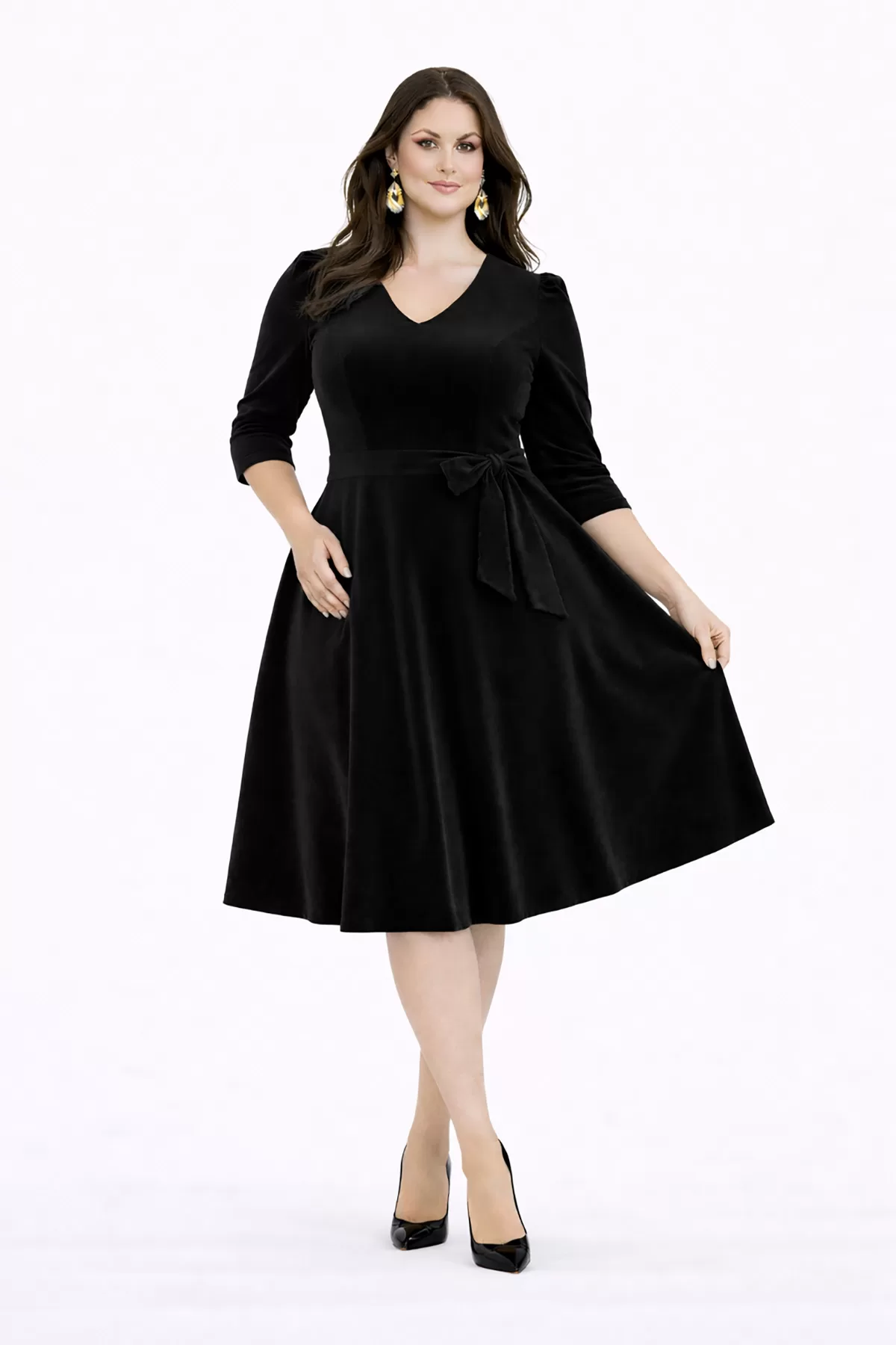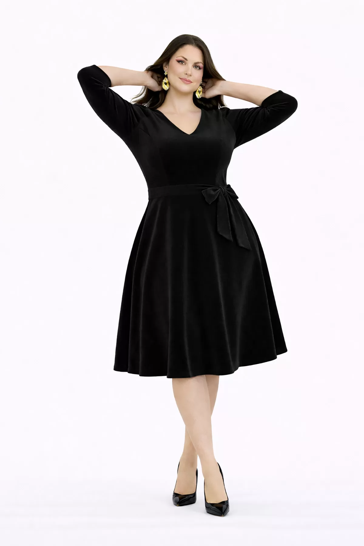 Ruris Kadın Siyah Kadife Truvakar Kol V Yaka Kuşaklı Kloş Midi Boy Büyük Beden