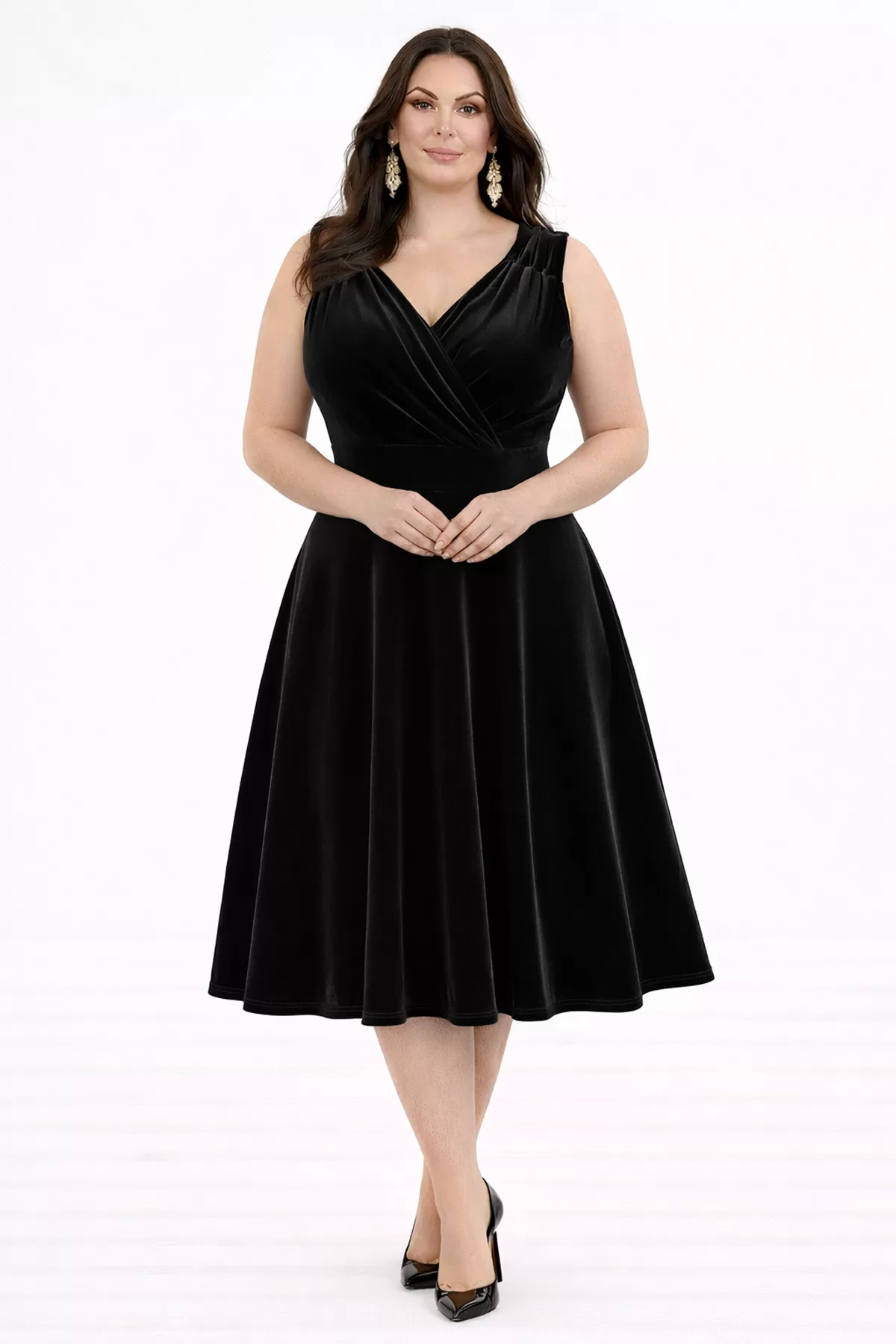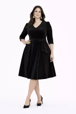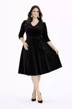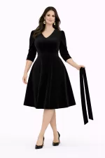 Kadın Siyah Kadife Truvakar Kol V Yaka Kuşaklı Kloş Midi Boy Büyük Beden Abiye Mezuniyet Elbisesi