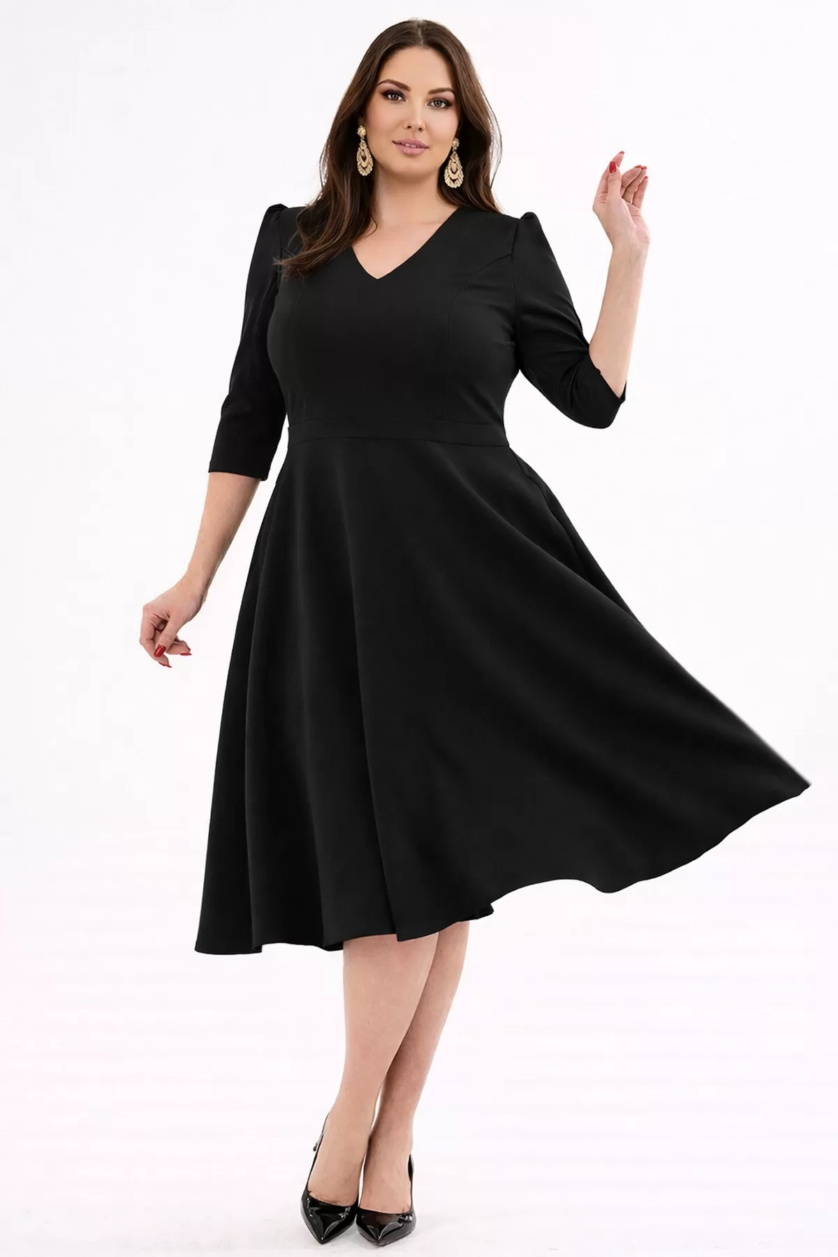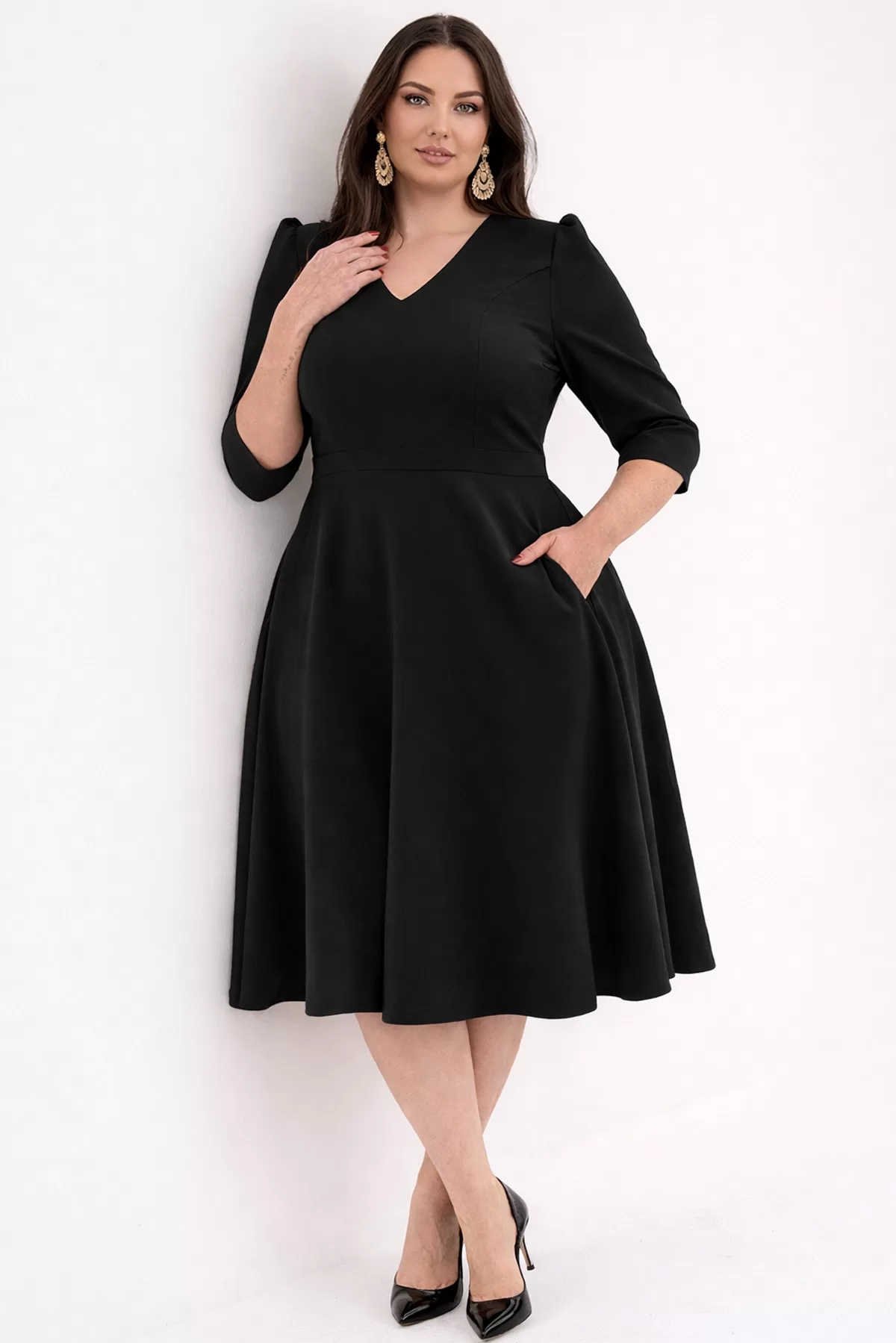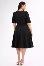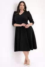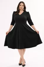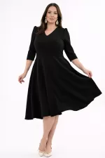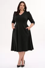 Kadın Siyah V Yaka Cepli Truvakar Kol Midi Kloş Double Kumaş Büyük Beden Elbise