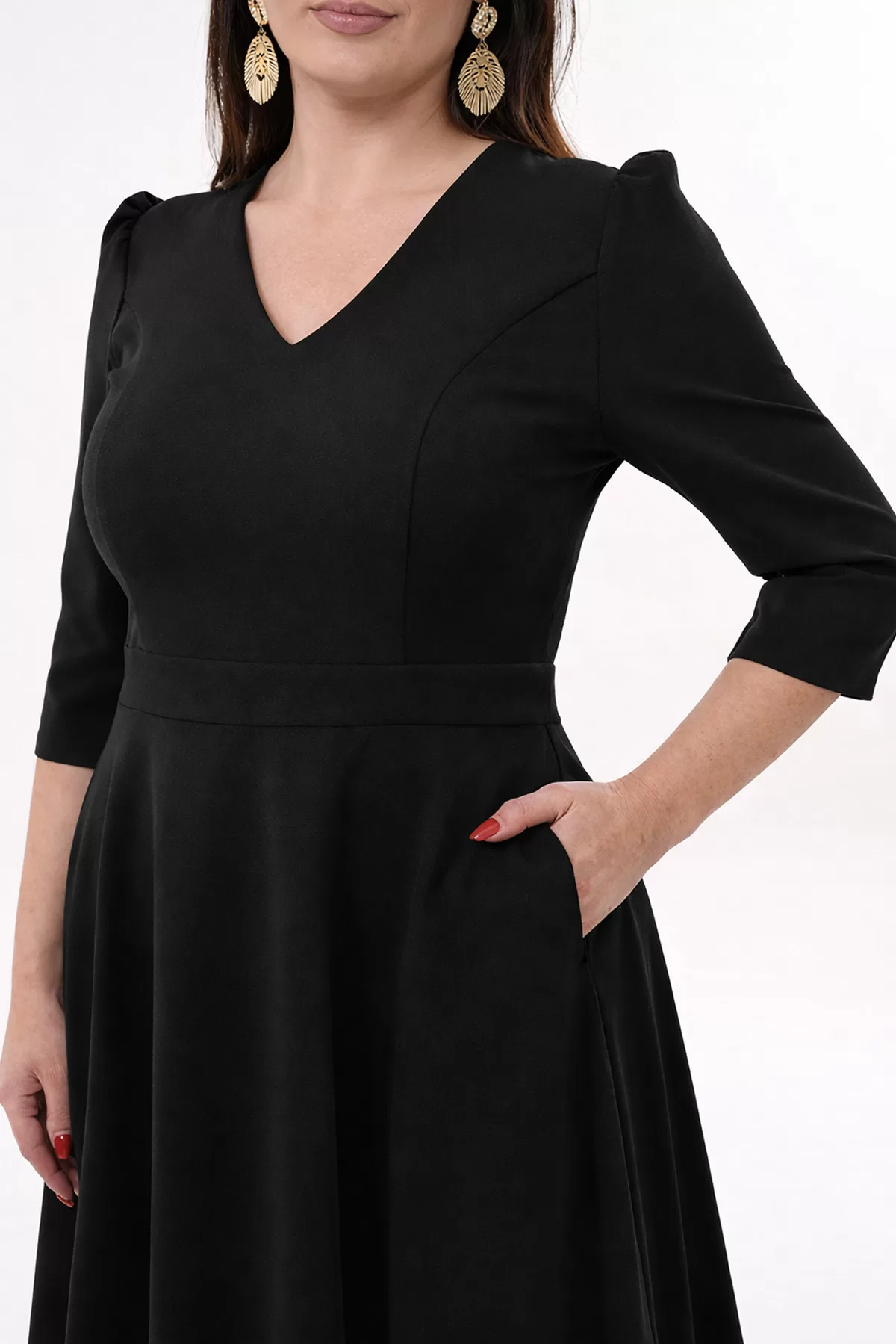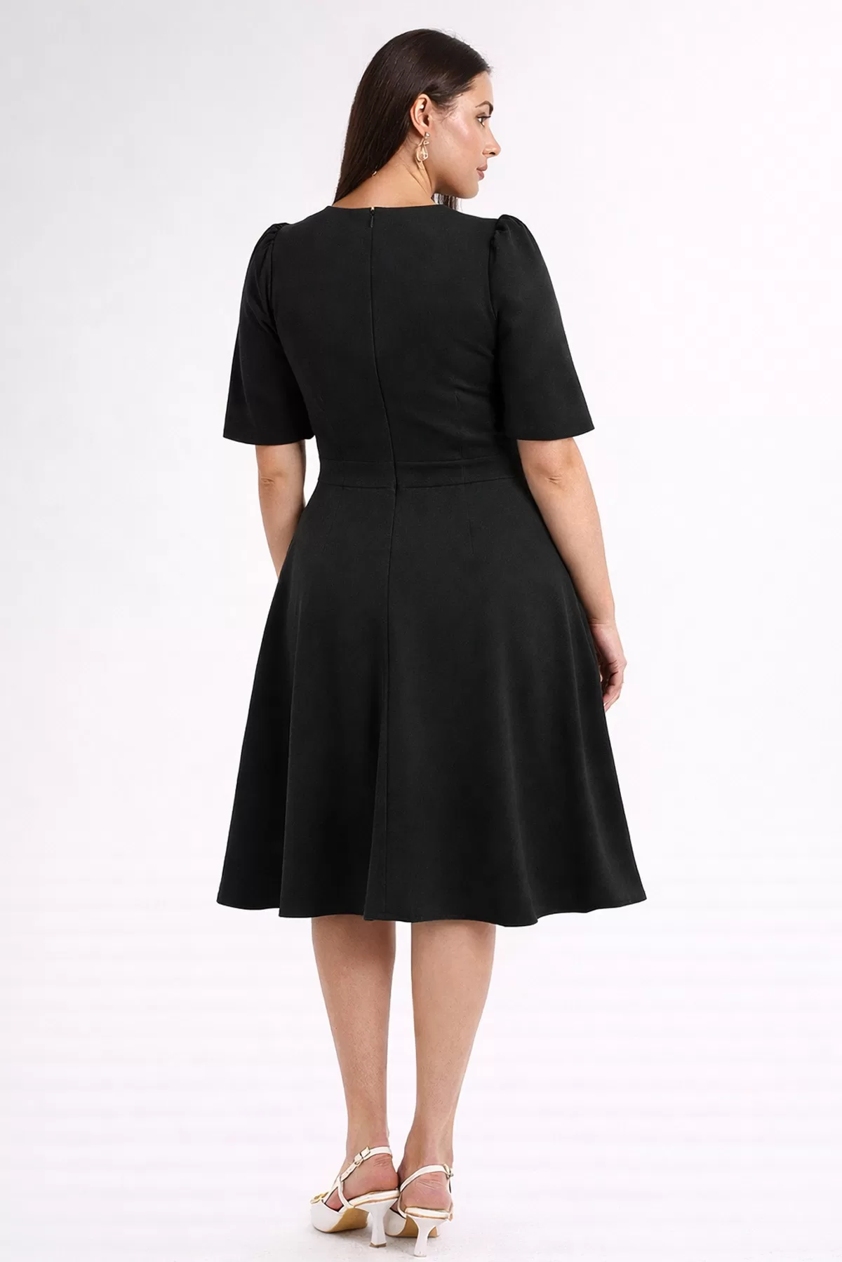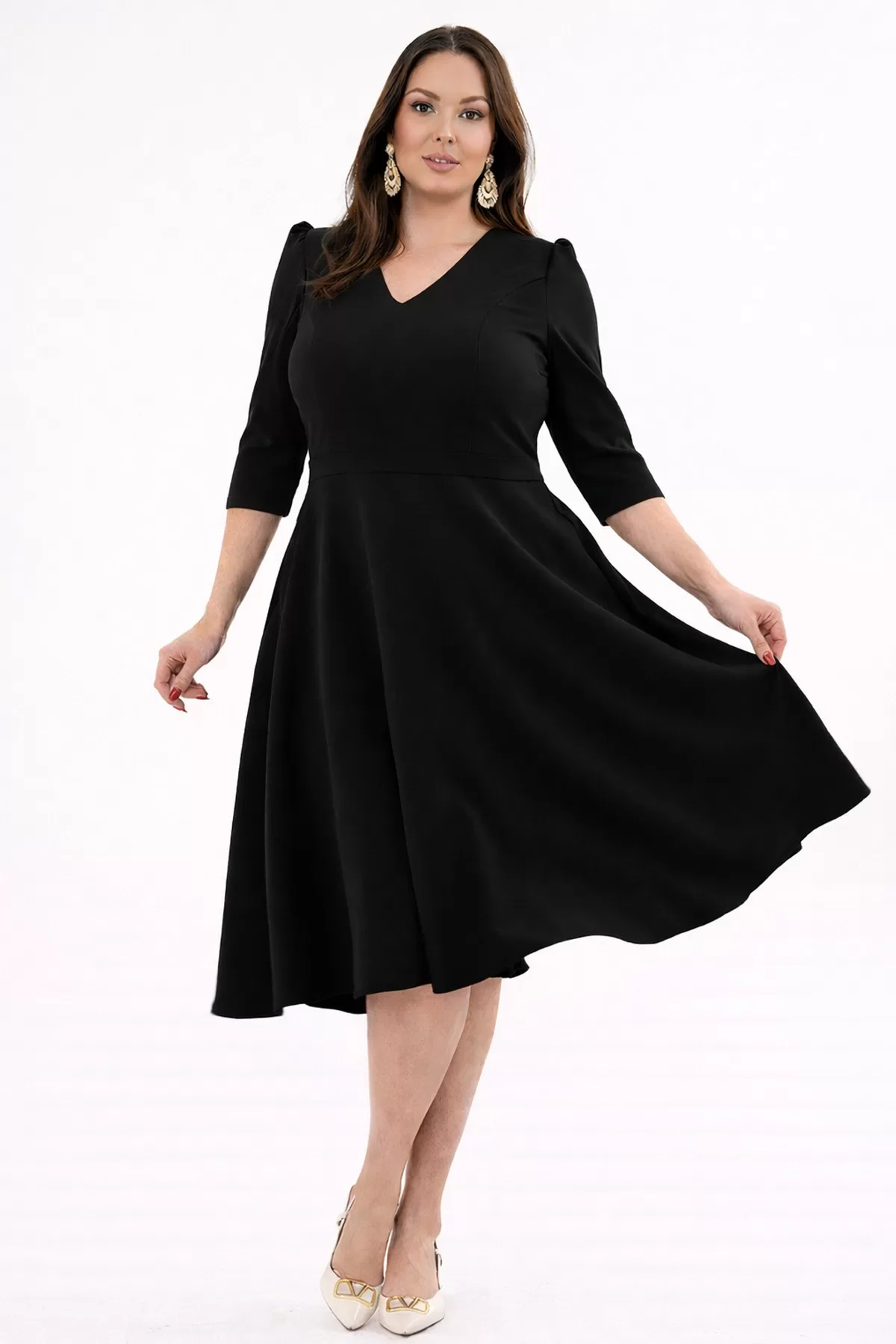 V yaka kesimi üst bedeni daha dengeli ve zarif gösterirken, kloş etek formu