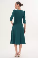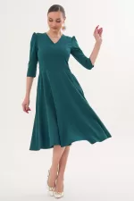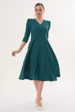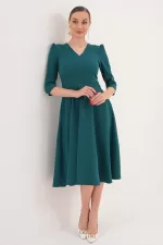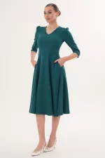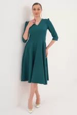 Kadın Zümrüt Yeşili V Yaka Cepli Truvakar Kol Midi Kloş Double Kumaş Elbise