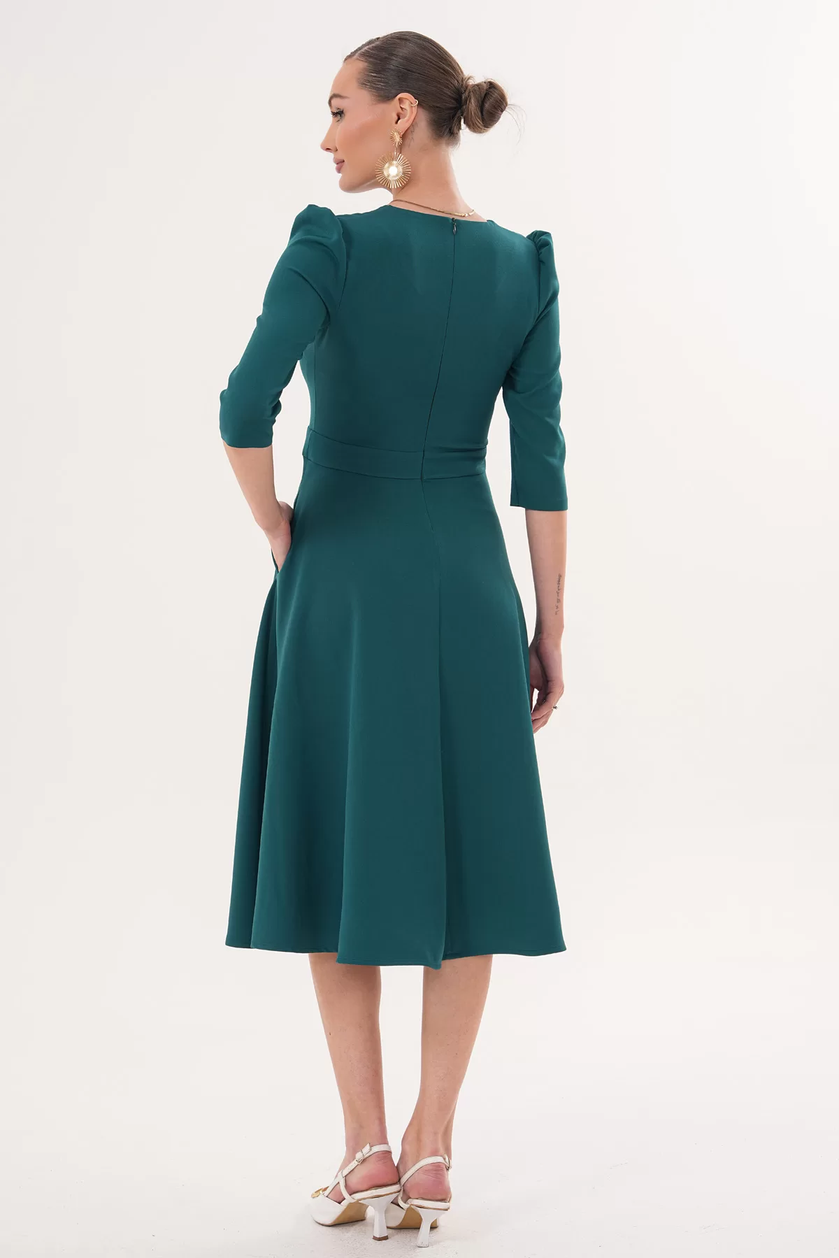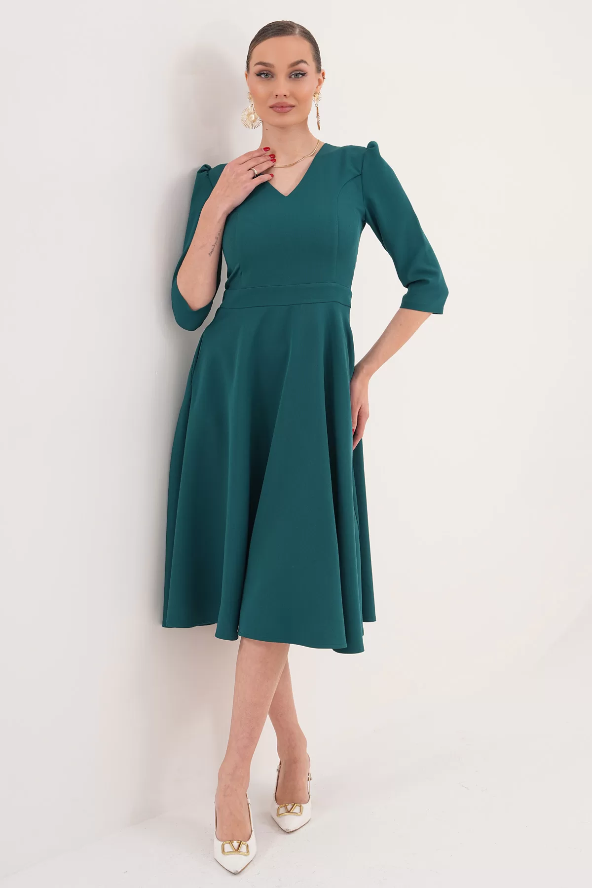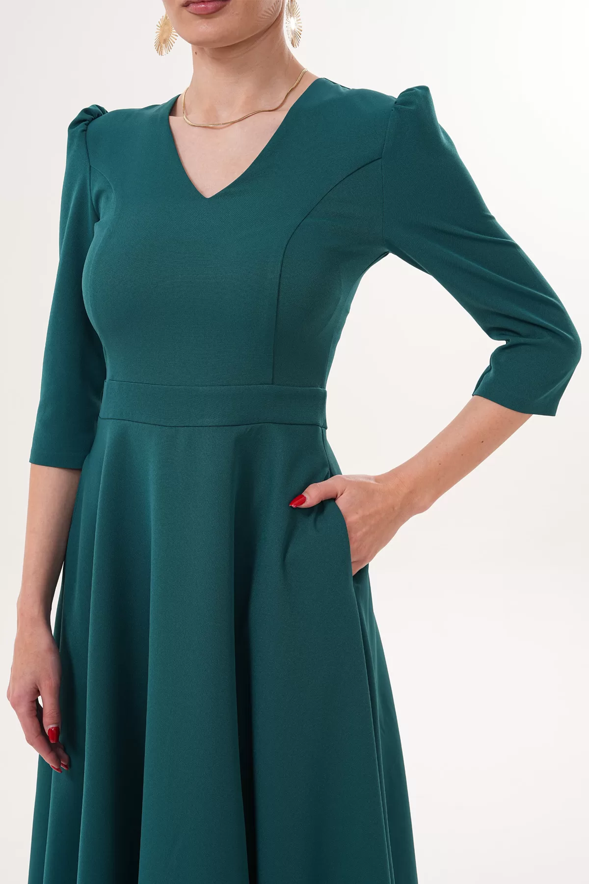 RURIS Kadın Zümrüt Yeşil V Yaka Cepli Truvakar Kol Midi Kloş Double Kumaş Elbise – Ürün Açıklaması