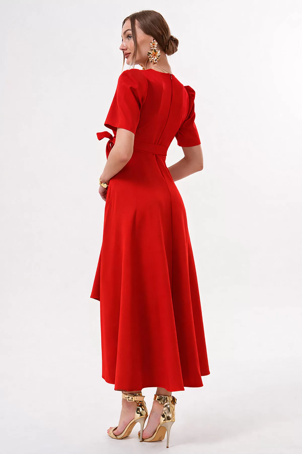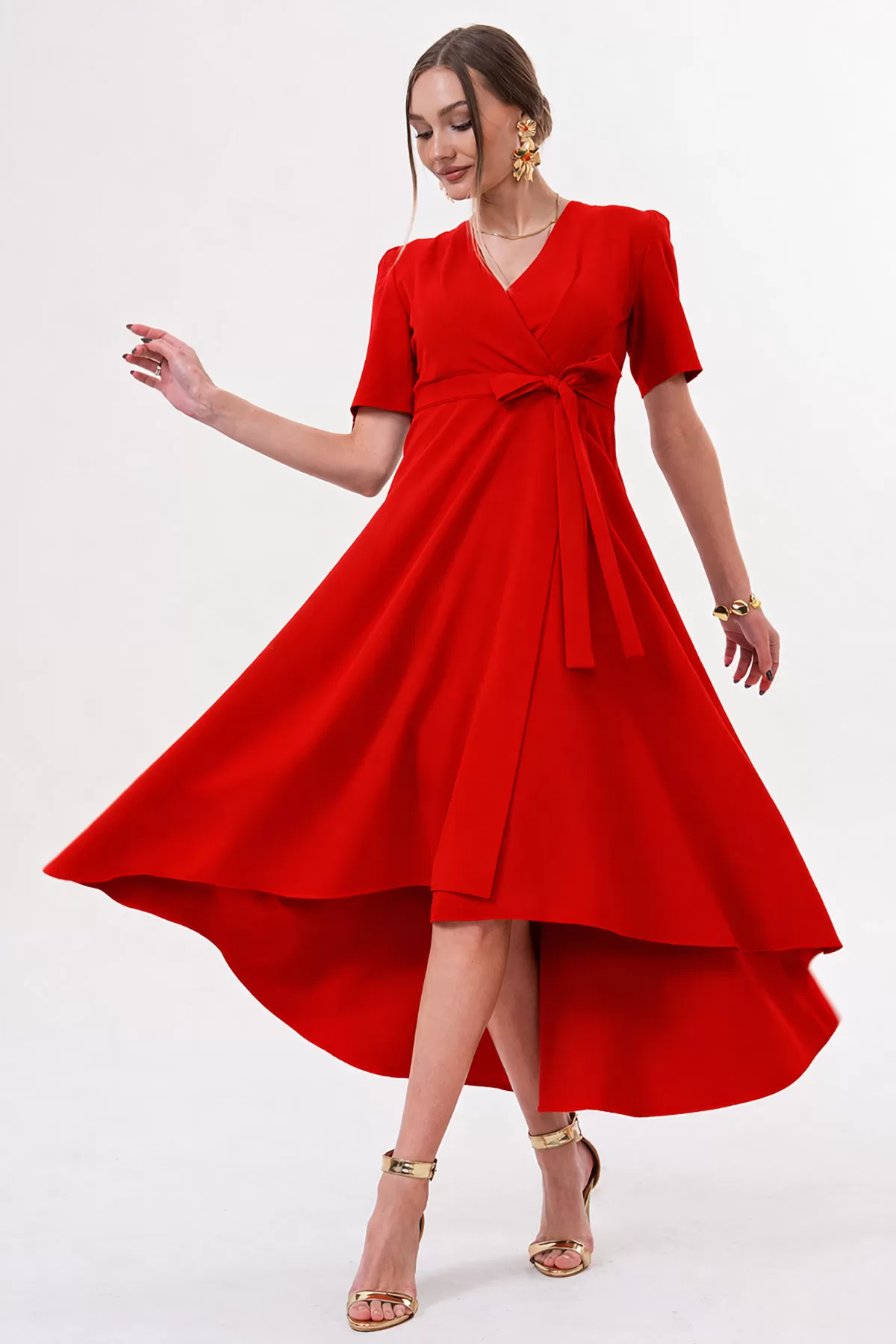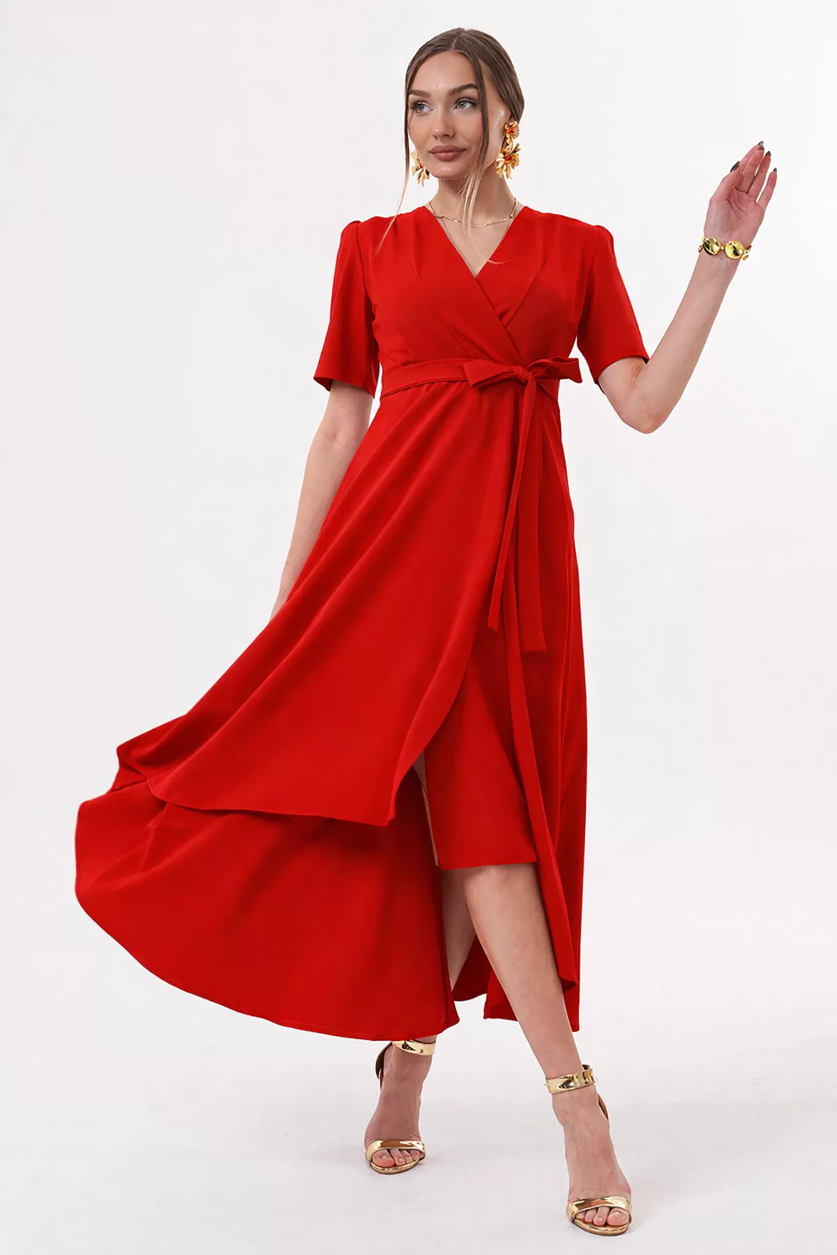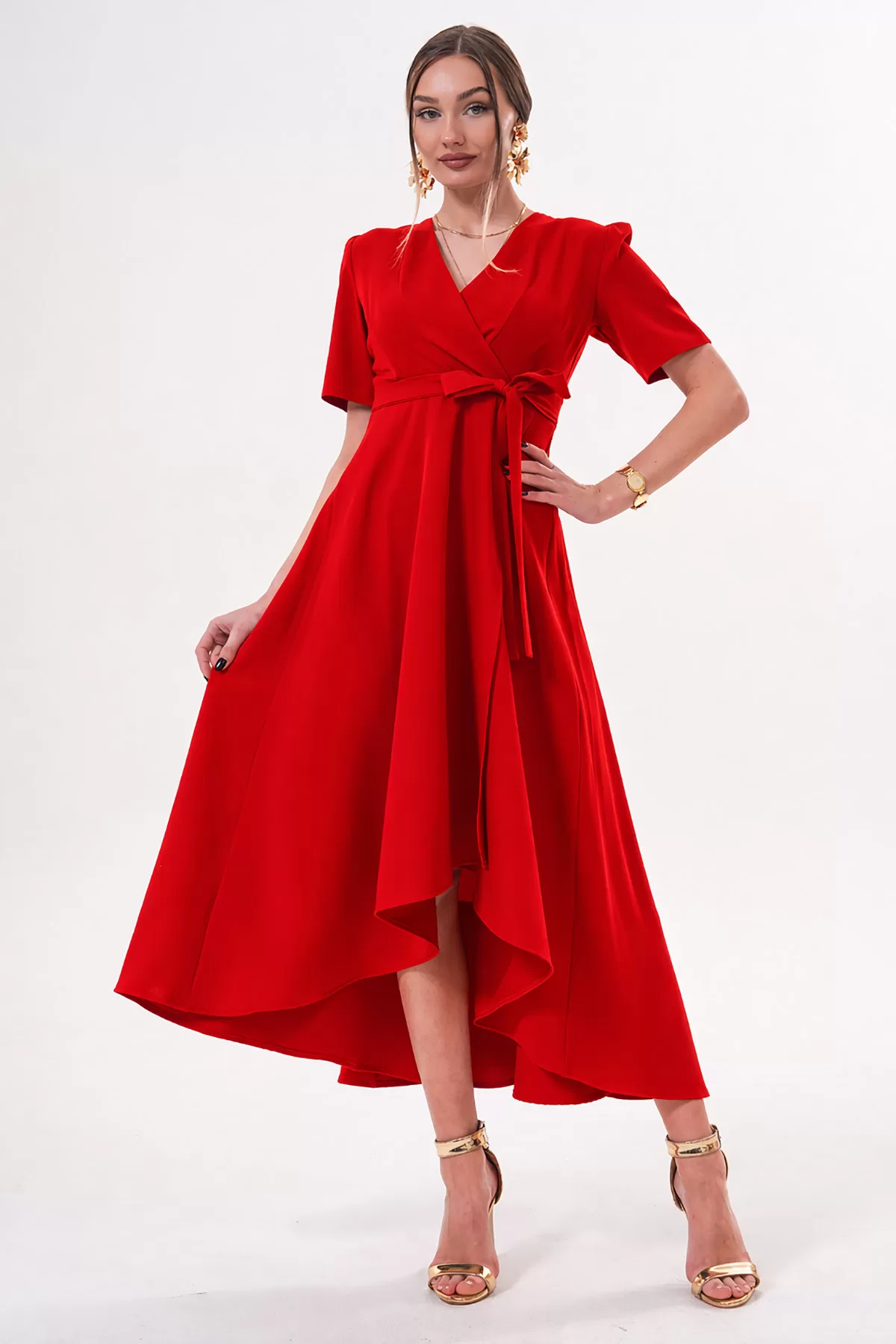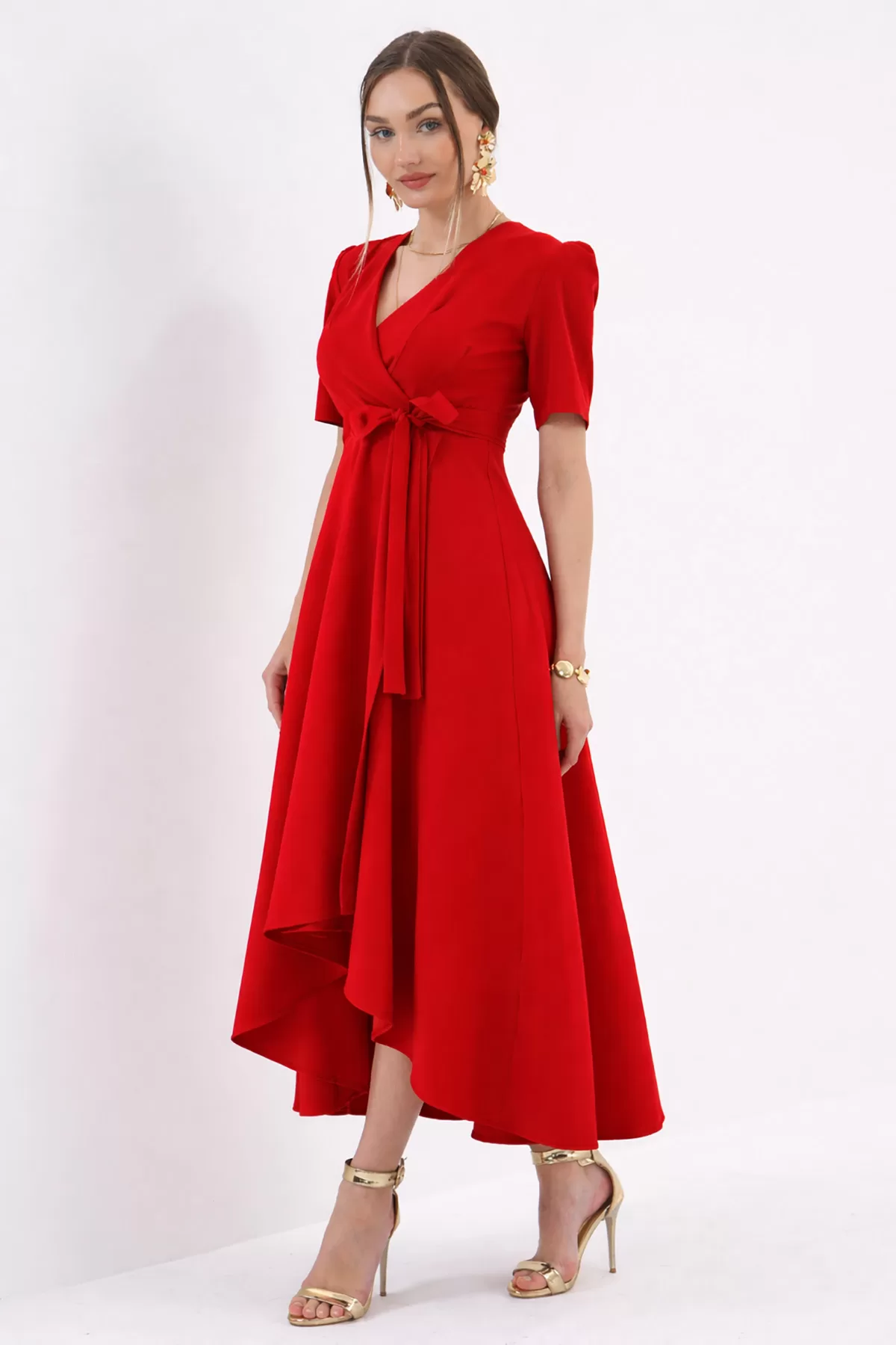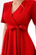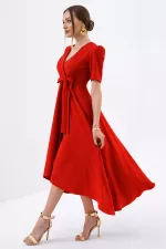 Kırmızı Kruvaze Yaka Asimetrik Sarmal Etek Kısa Kollu Kuşaklı Midi Boy Abiye Mezuniyet Elbisesi