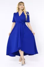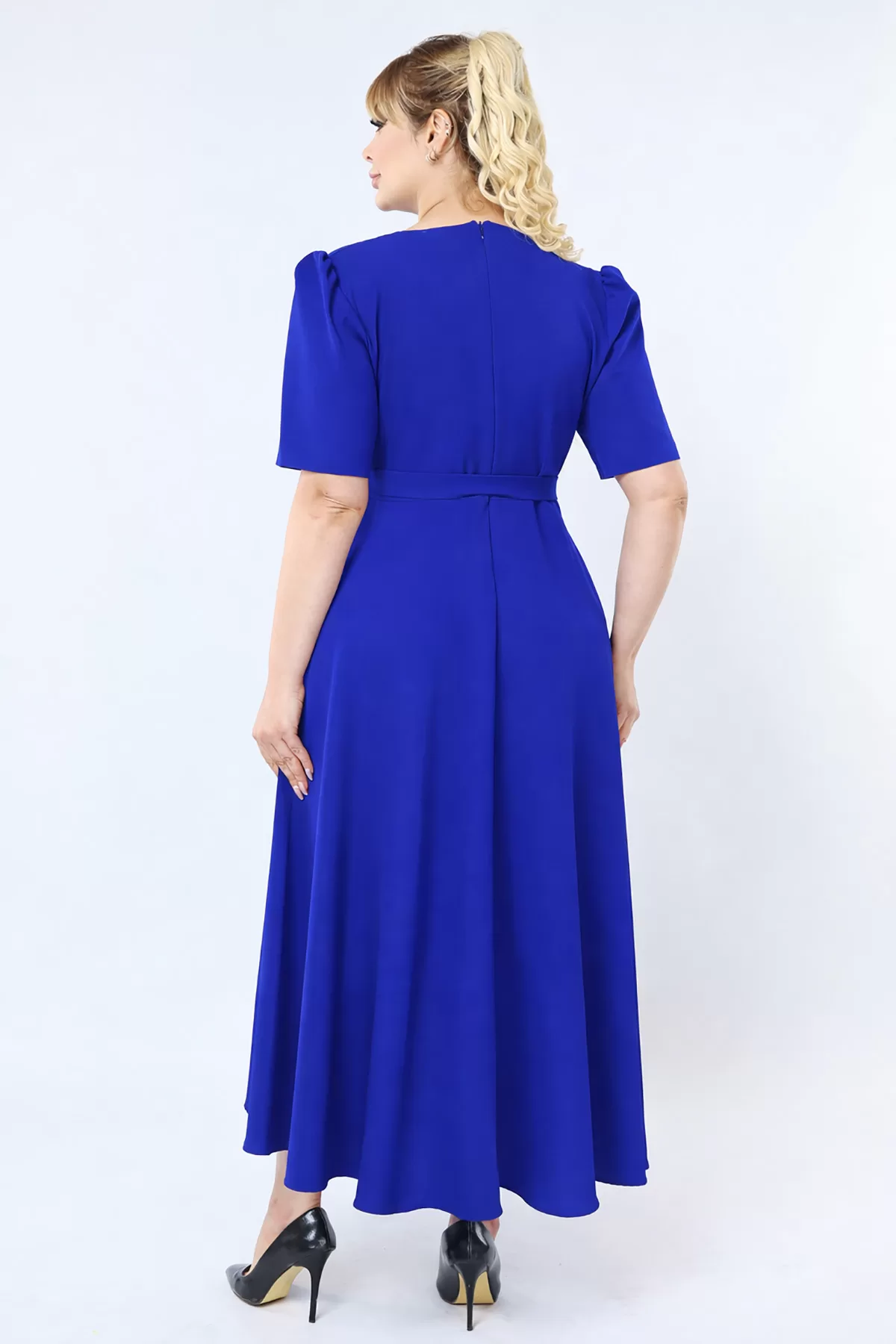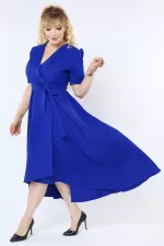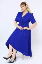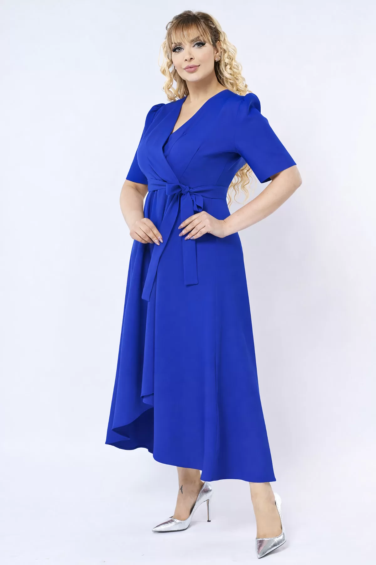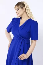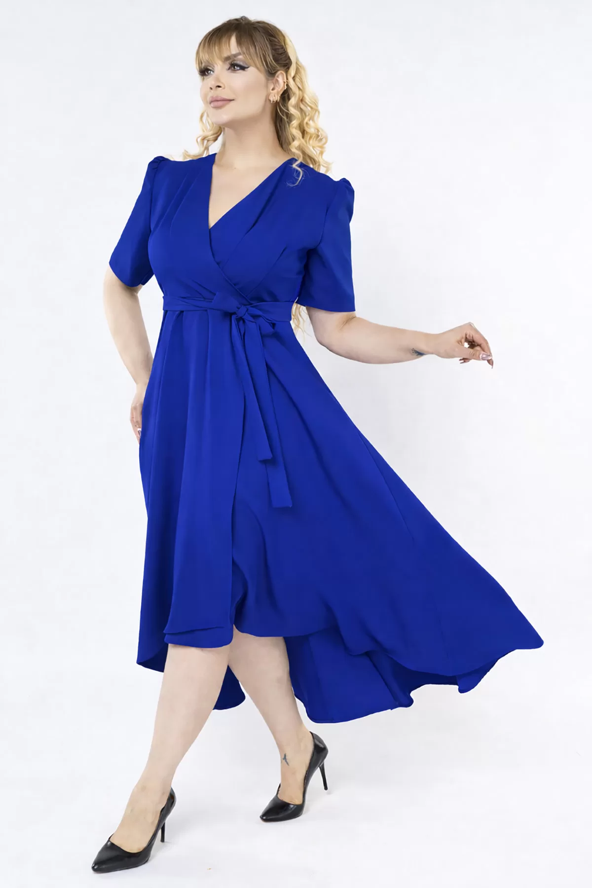 Saks Mavi Kruvaze Yaka Asimetrik Sarmal Etek Kısa Kollu Kuşaklı Midi Boy Büyük Beden Abiye Elbise