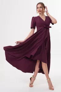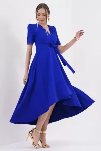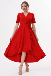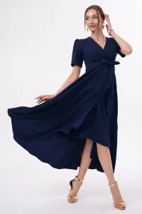 Siyah Kruvaze Yaka Asimetrik Kesim Sarmal Etek Kısa Kollu Kuşaklı Midi Boy Abiye Mezuniyet Elbisesi