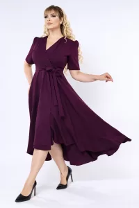 Bordo Kruvaze Yaka Asimetrik Kesim Sarmal Etek Kısa Kollu Kuşaklı Midi Boy Büyük Beden Abiye Elbise