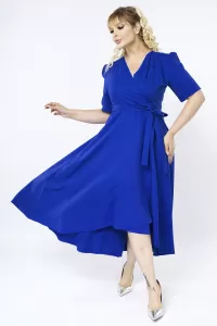 Saks Mavi Kruvaze Yaka Asimetrik Sarmal Etek Kısa Kollu Kuşaklı Midi Boy Büyük Beden Abiye Elbise